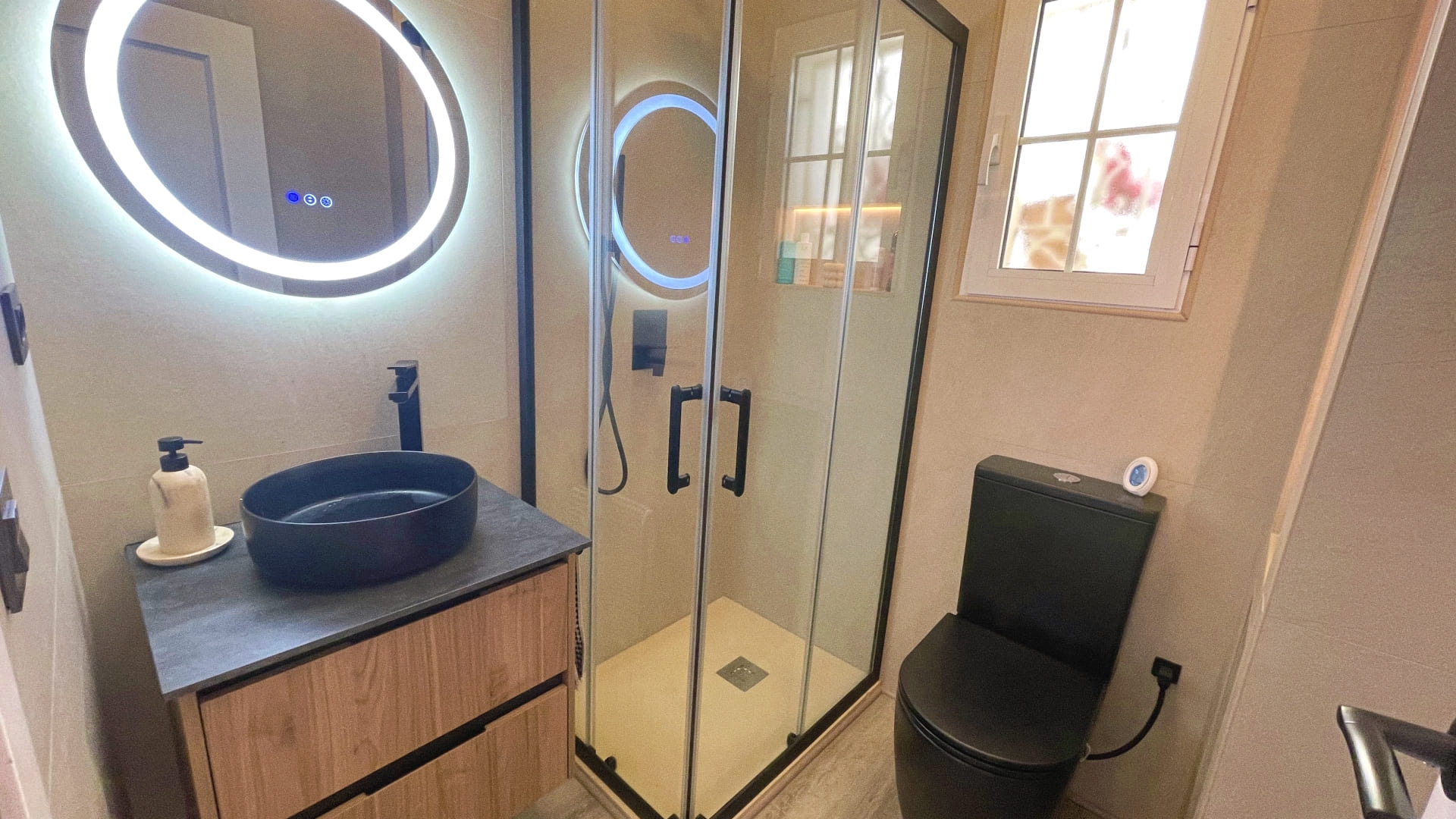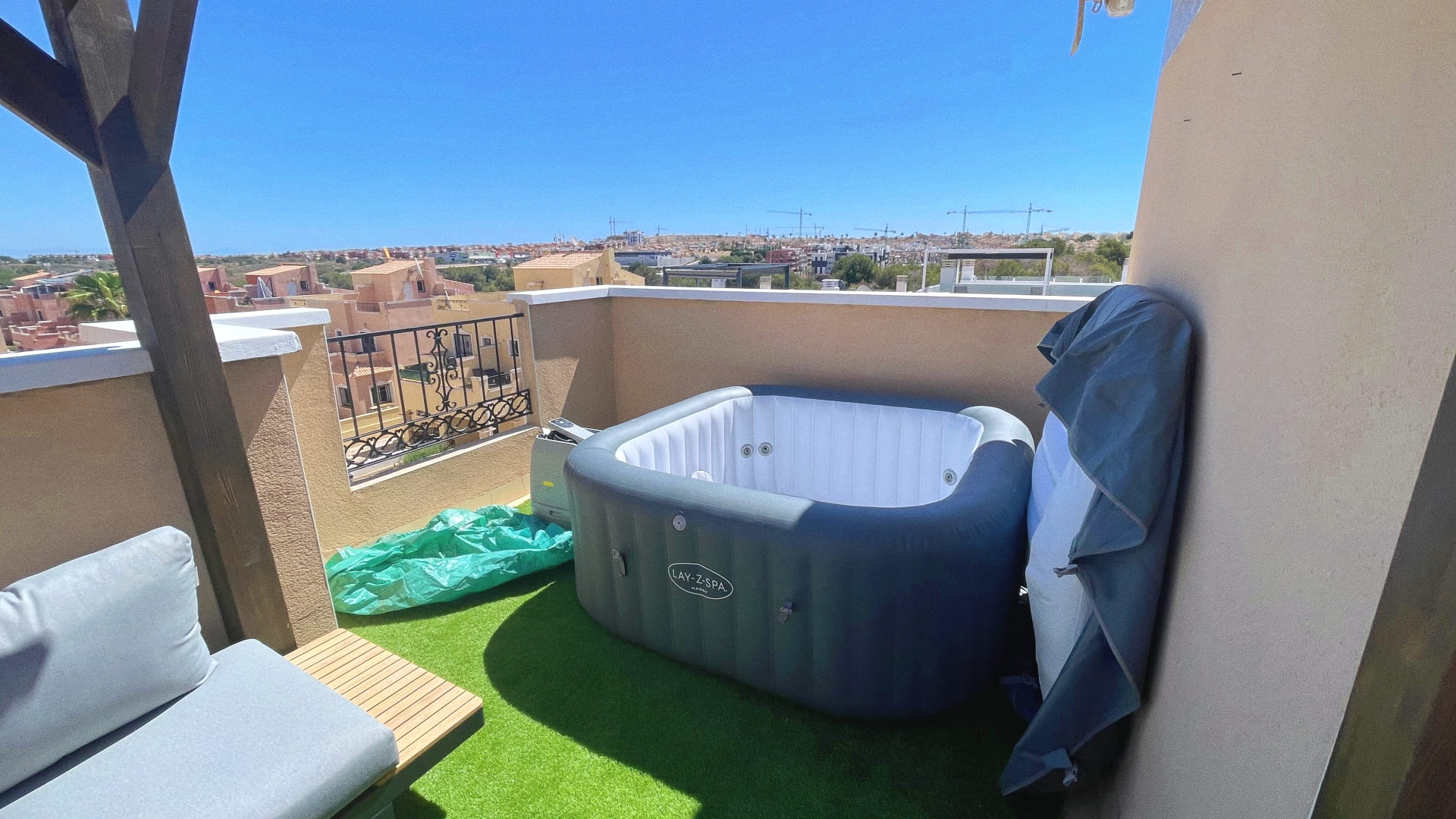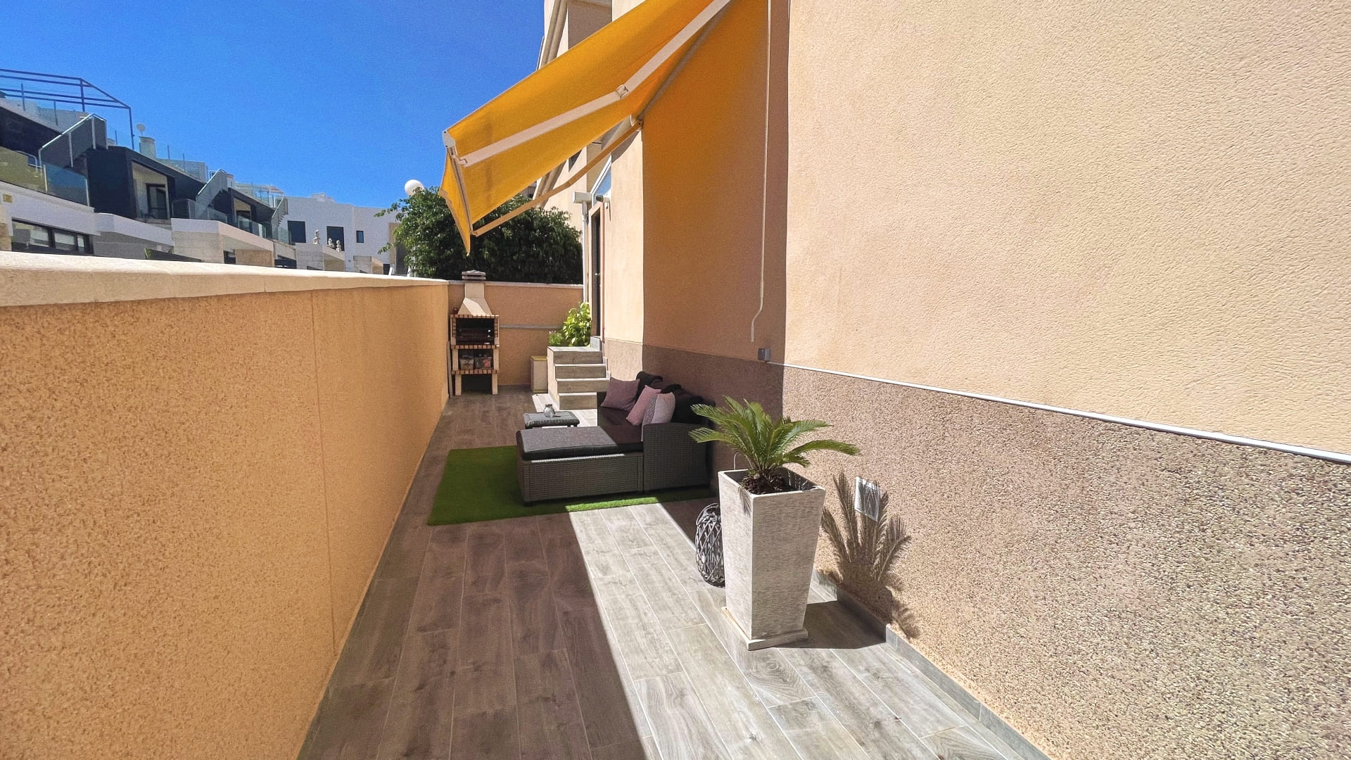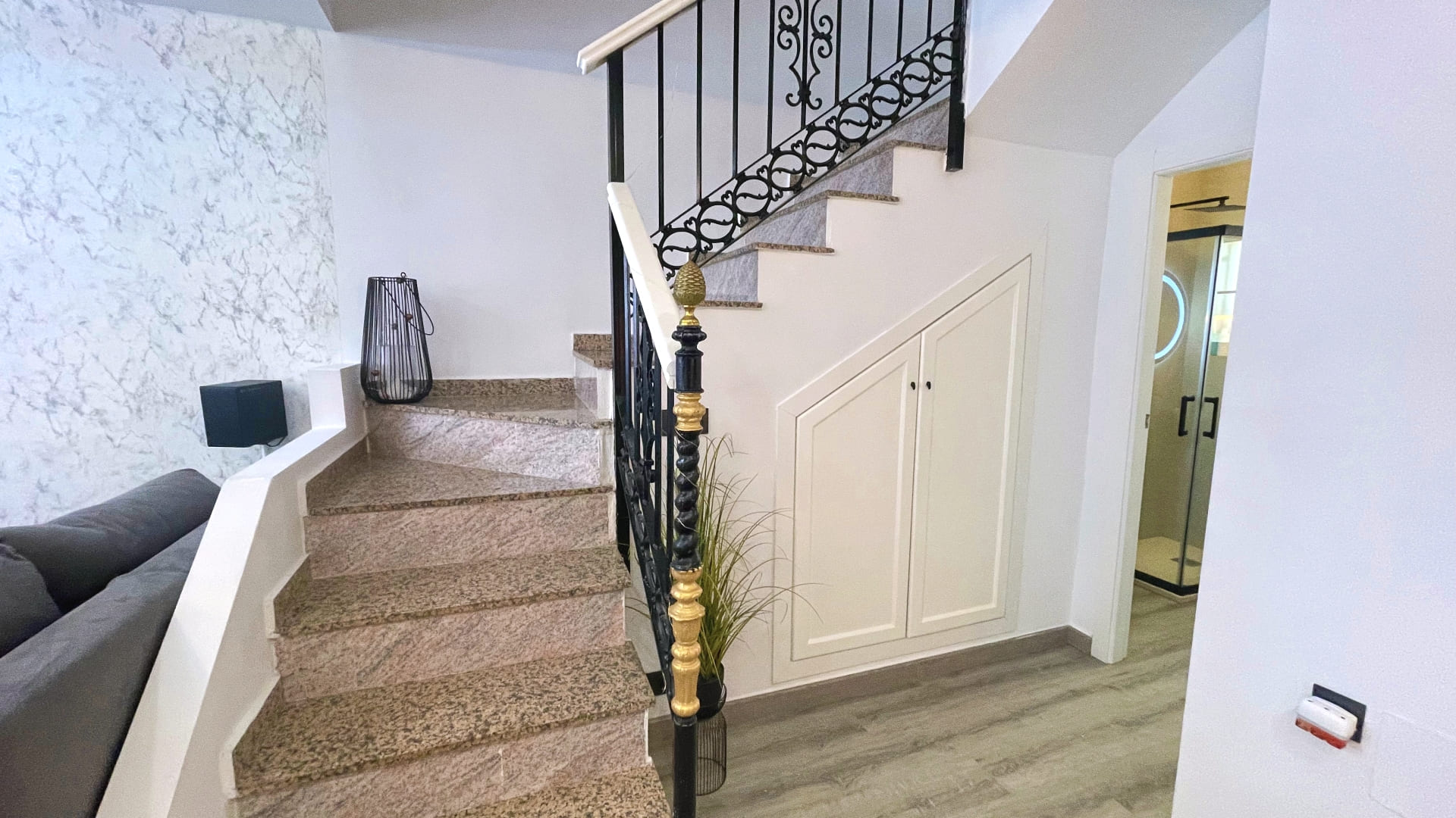 El exterior es uno de sus grandes atractivos. Cuenta con un jardín privado de 81 m², perfecto para disfrutar del clima mediterráneo durante todo el año, además de un solárium ideal para relajarte, tomar el sol o crear tu rincón personal al aire libre. También encontrarás un porche cerrado que aporta calidez y puede ser utilizado como sala adicional o zona de descanso.