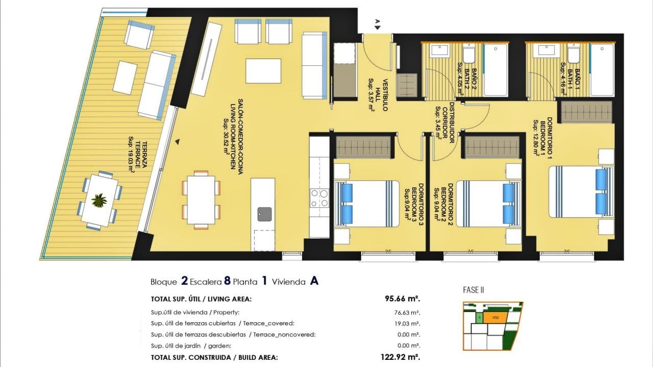 El apartamento cuenta con una superficie total de 123 m² (96 m² útiles), distribuidos en 3 dormitorios amplios y soleados y 2 baños elegantes con acabados de calidad. Cada espacio transmite amplitud y armonía. El salón se conecta con una impresionante terraza de 19 m², un espacio perfecto para relajarse, disfrutar del clima mediterráneo, desayunar o recibir invitados al aire libre. La combinación de diseño contemporáneo y estilo mediterráneo resulta irresistible.