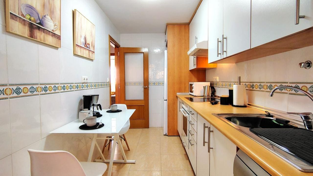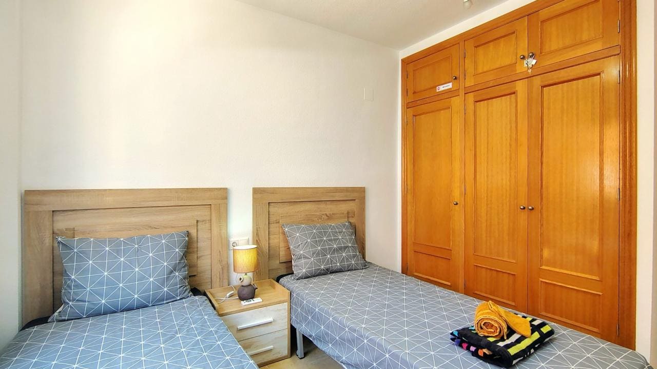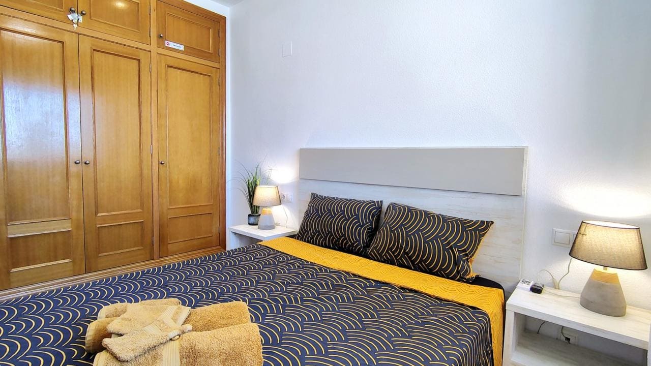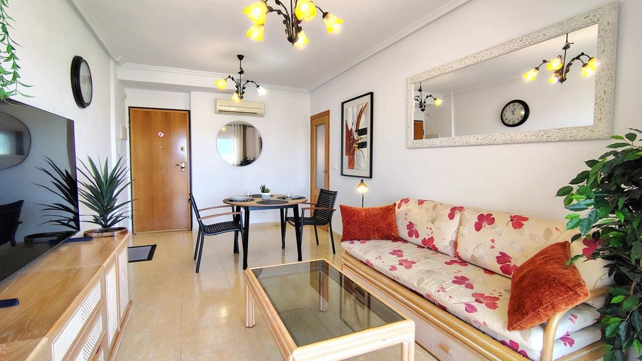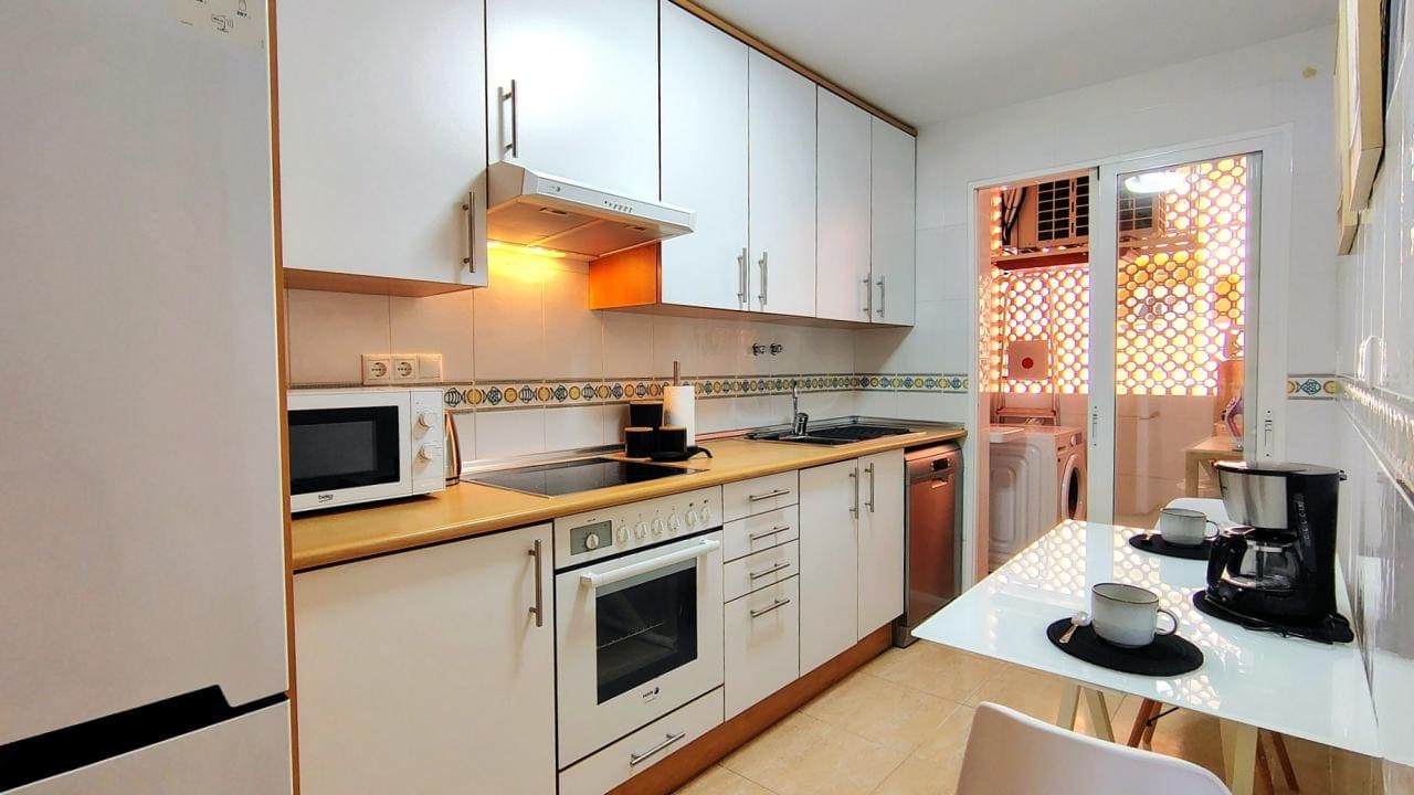 El interior del apartamento está diseñado para la comodidad, con dos dormitorios llenos de luz y un baño completo. La cocina está totalmente equipada para todas sus necesidades, y el salón-comedor es amplio y confortable, contando con aire acondicionado. El salón tiene acceso directo a una acogedora terraza privada que ofrece vistas parciales al mar, el espacio ideal para relajarse y cenar al aire libre. La vivienda se entrega completamente preparada, incluyendo ropa de cama, toallas y menaje.