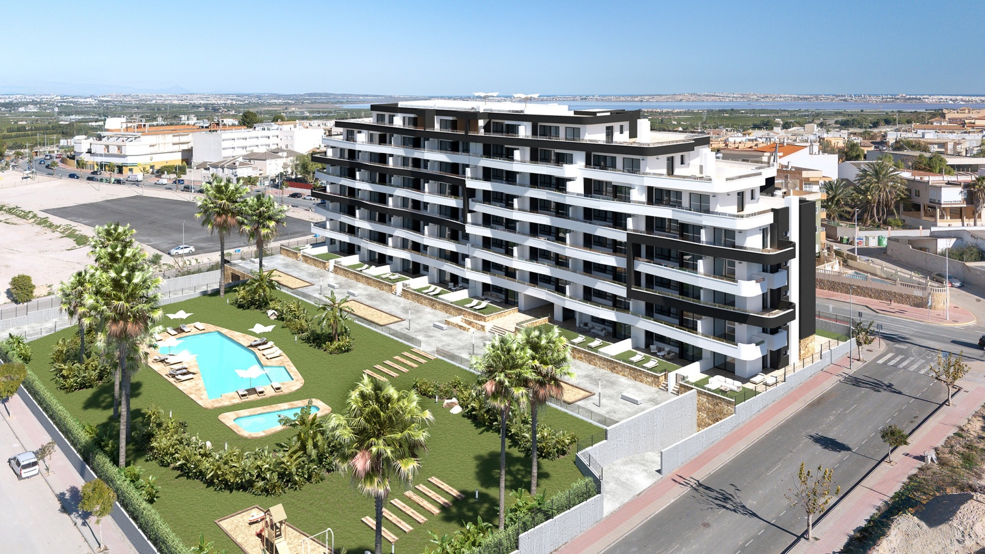 Presentamos una nueva promoción residencial situada en San Miguel de Salinas, un enclave idóneo que se distingue por su entorno sereno y natural, a tan solo 8 km de las espléndidas playas de Orihuela Costa, Torrevieja y Guardamar, lo que convierte a esta ubicación en un verdadero refugio para quienes buscan la combinación perfecta entre tranquilidad y cercanía al mar. Este complejo residencial, que se erige con un diseño moderno e innovador, alberga 112 apartamentos que ofrecen un estilo de vida contemporáneo y sofisticado, ideal para disfrutar de la luz y el clima mediterráneo en su máxima expresión. Con amplias zonas comunes que invitan al esparcimiento y la relajación, esta propiedad se presenta como una opción inmejorable para aquellos que desean vivir rodeados de naturaleza sin renunciar a la comodidad de la vida moderna.