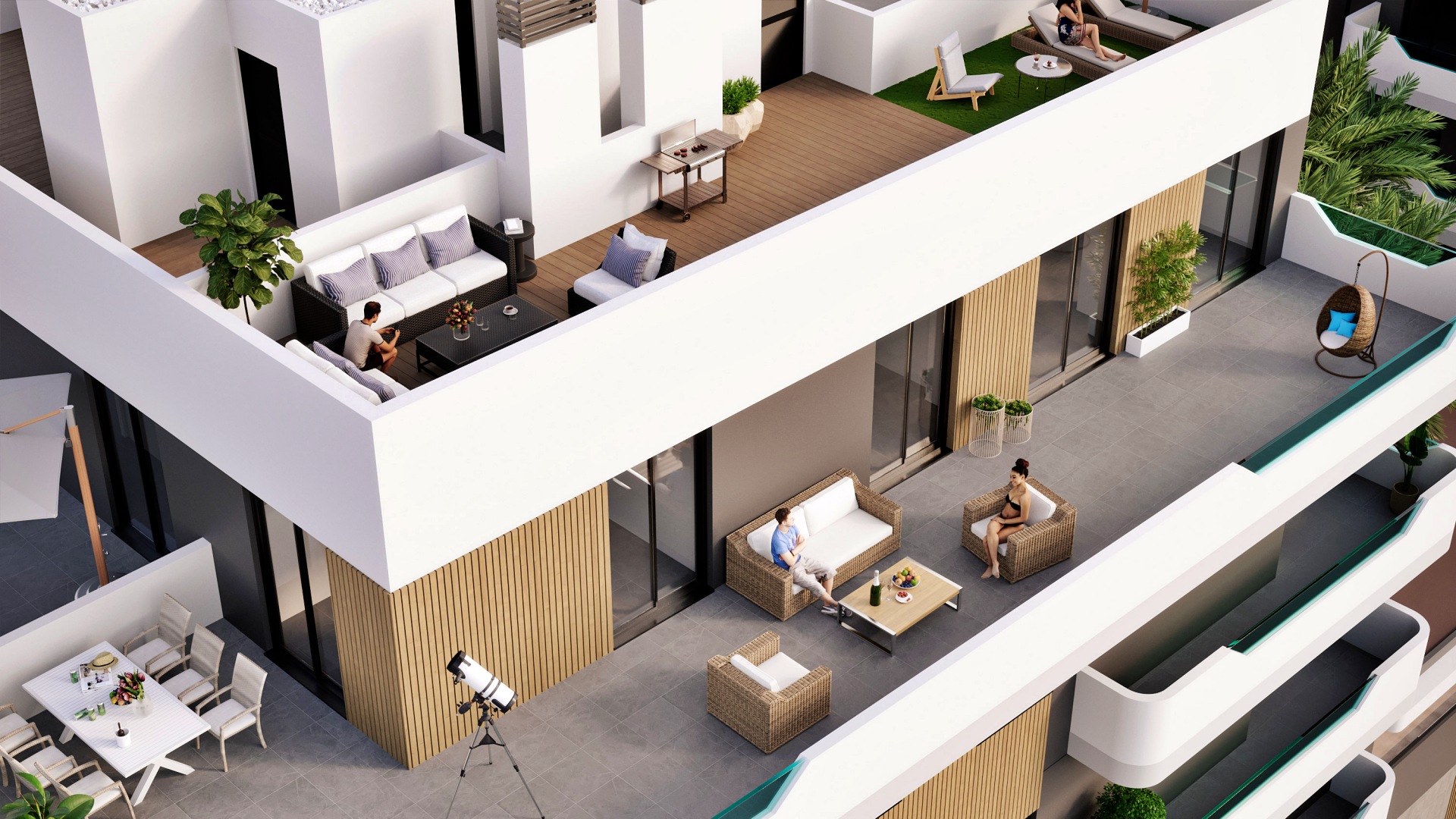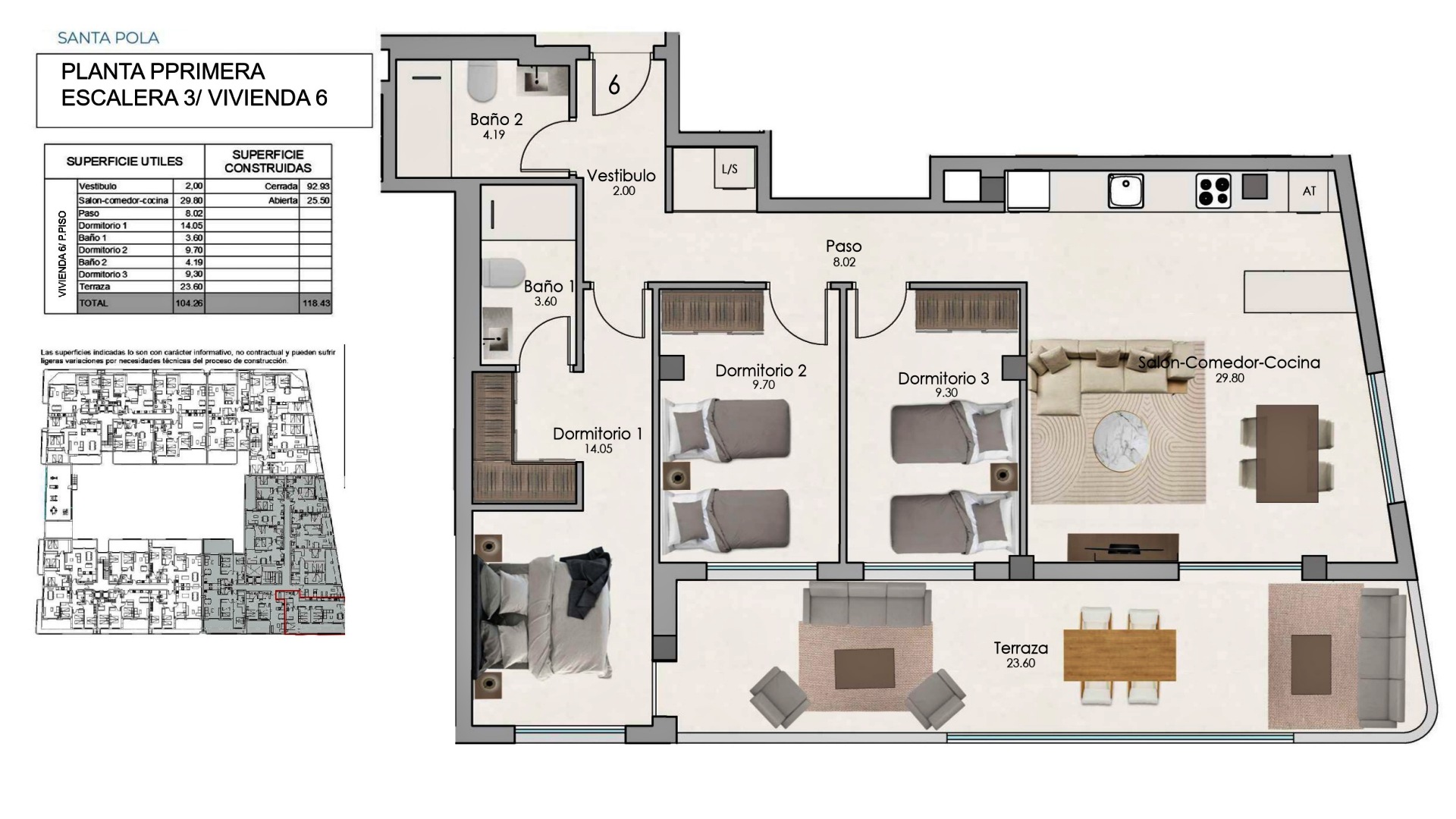 Este nuevo proyecto residencial se encuentra en Santa Pola, a tan solo 500 metros de la playa y del centro urbano, en una ubicación privilegiada con todos los servicios esenciales a poca distancia: supermercados, colegios, hospitales, comercios, restaurantes y zonas de ocio. Además, el aeropuerto de Alicante se sitúa a solo 20 minutos en coche, lo que convierte esta promoción en una opción ideal tanto para vivir todo el año como para inversión o segunda residencia. El complejo está compuesto por cuatro bloques de apartamentos, con viviendas de 1, 2 y 3 dormitorios distribuidas en planta baja, primera, segunda y tercera. En la última planta se ofrecen exclusivos áticos de 2 y 3 dormitorios, todos ellos con solárium privado con acceso directo desde el interior de la vivienda, aportando un espacio exterior adicional para disfrutar del clima mediterráneo.