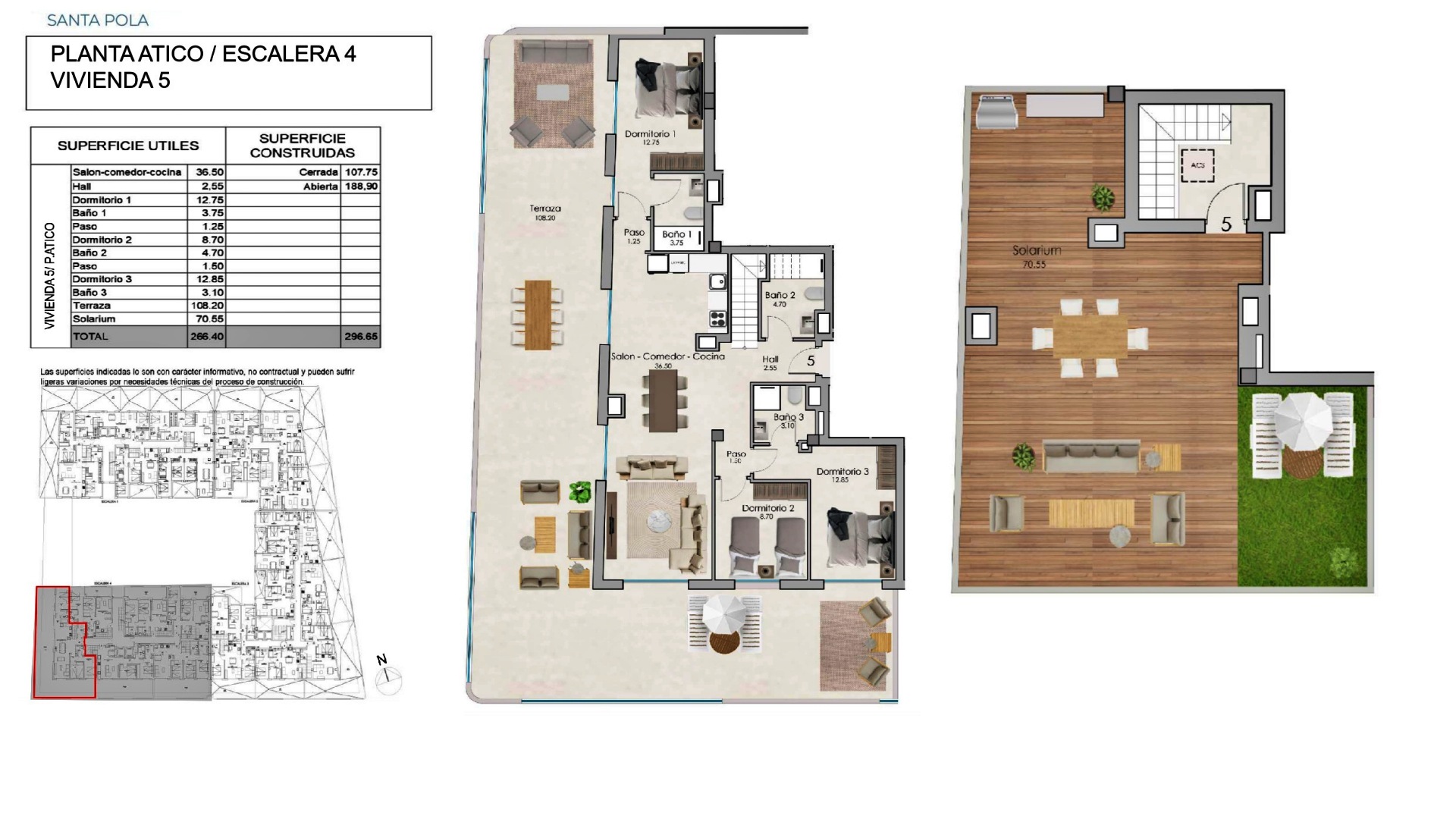 Además, se ofrece un exclusivo ático de 3 dormitorios y 2 baños, con una amplia superficie de 297 m² y un solárium privado de 70 m², ideal para disfrutar del sol mediterráneo y de total privacidad, con un precio de 530.000 €.