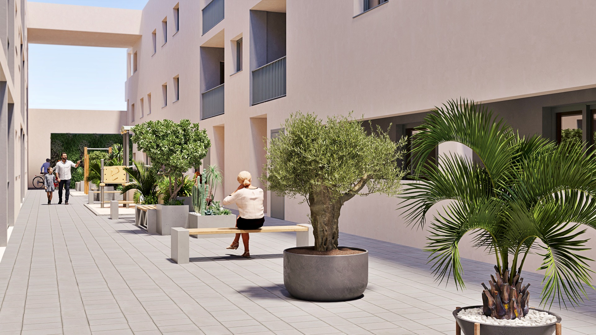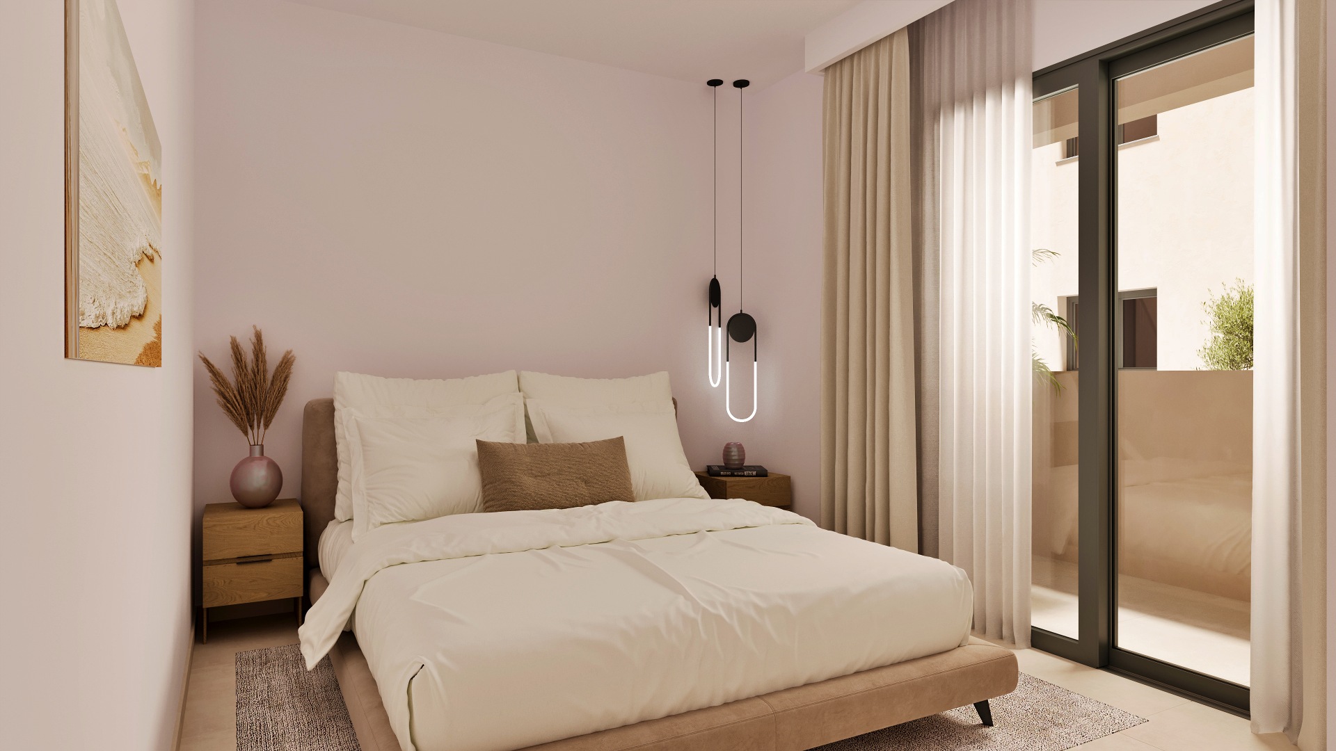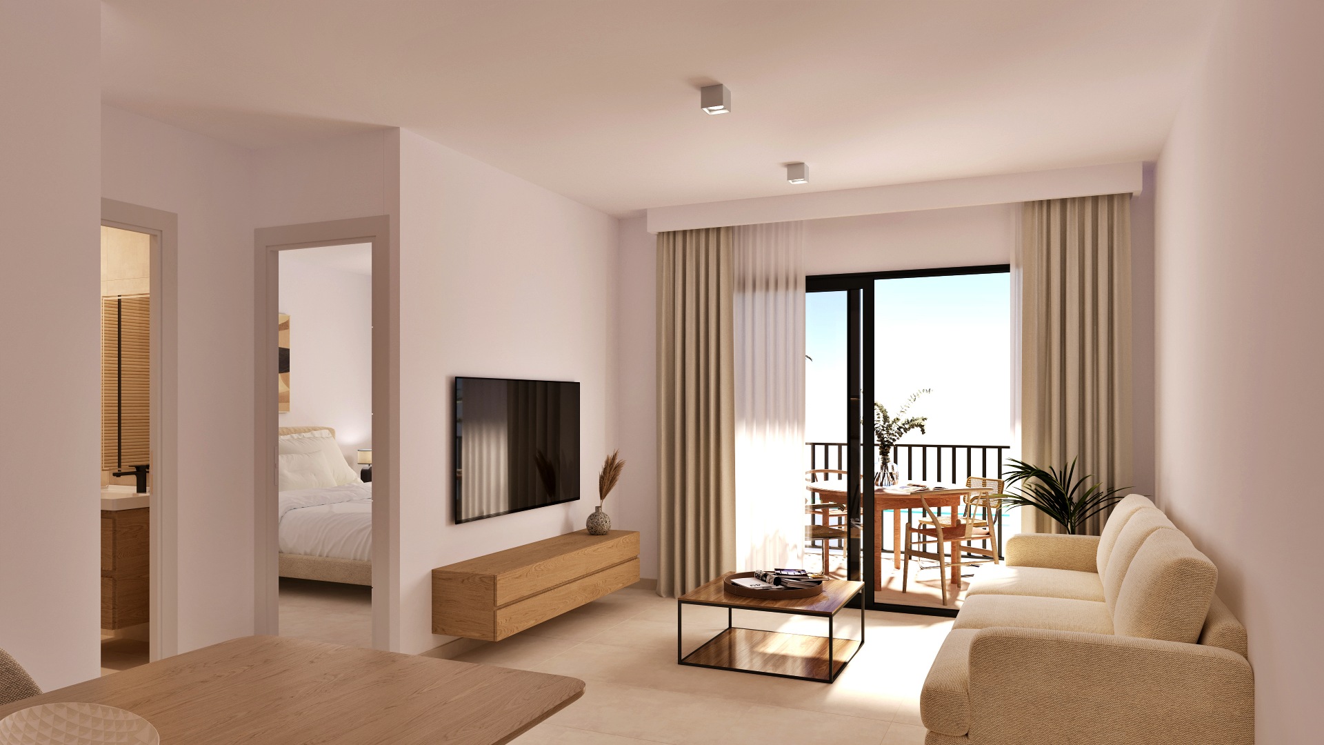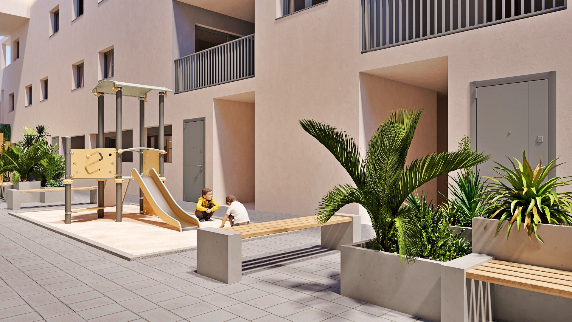 Los apartamentos de 2 dormitorios disponen de 1 o 2 baños, con superficies interiores que van desde 64 m² hasta 74 m², terrazas de 12,90 m² y una superficie total de 76,90 m² a 86,90 m². Son viviendas luminosas y bien distribuidas, ideales tanto para familias como para quienes buscan más espacio para teletrabajar o recibir invitados. Los precios de estas unidades oscilan entre 155.000 € y 180.000 €.