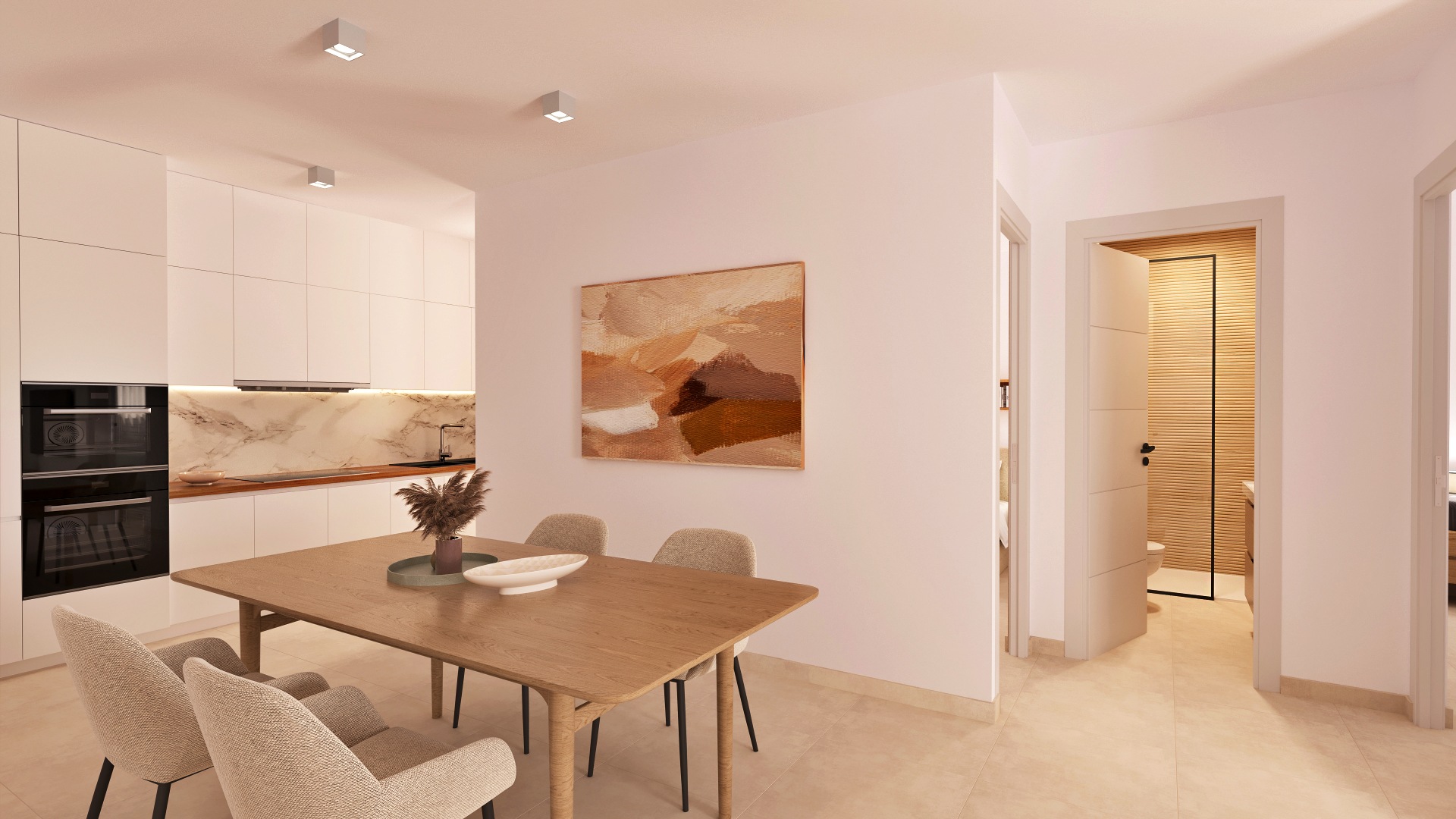 Para quienes buscan un formato más exclusivo, el proyecto ofrece áticos de 2 dormitorios y 2 baños, con una superficie interior de 84,55 m² y una espectacular terraza privada de 44,50 m², perfecta para crear una zona chill out, comedor exterior o espacio de descanso con vistas abiertas al entorno natural. El precio de los áticos es de 235.000 €.
