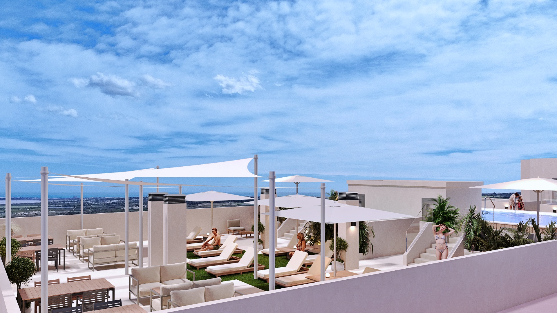 El complejo destaca por sus zonas comunes en la azotea, con piscina y espacios de relax, desde donde se disfrutan vistas panorámicas al emblemático Laguna Rosa de Torrevieja. Las viviendas cuentan con calidades actuales, soluciones de eficiencia energética y un diseño pensado para el confort durante todo el año.