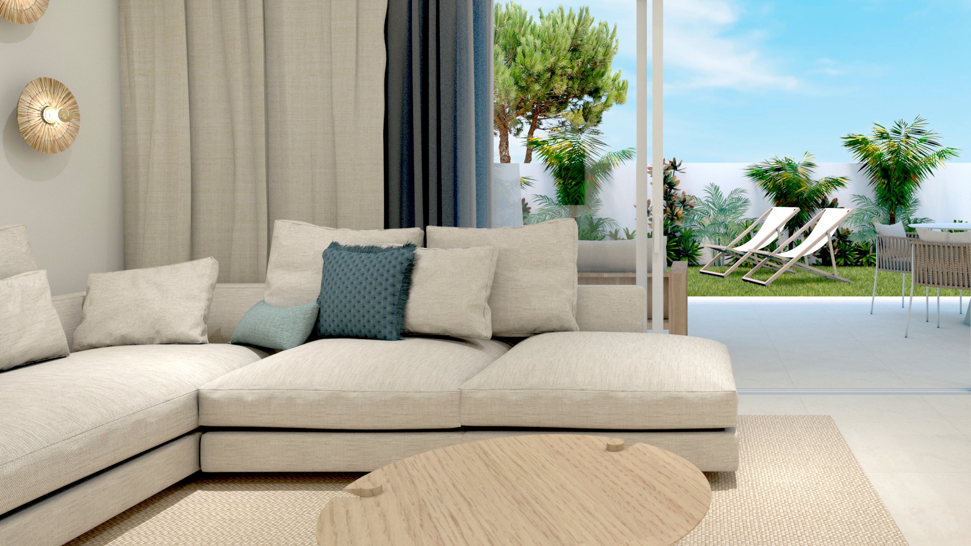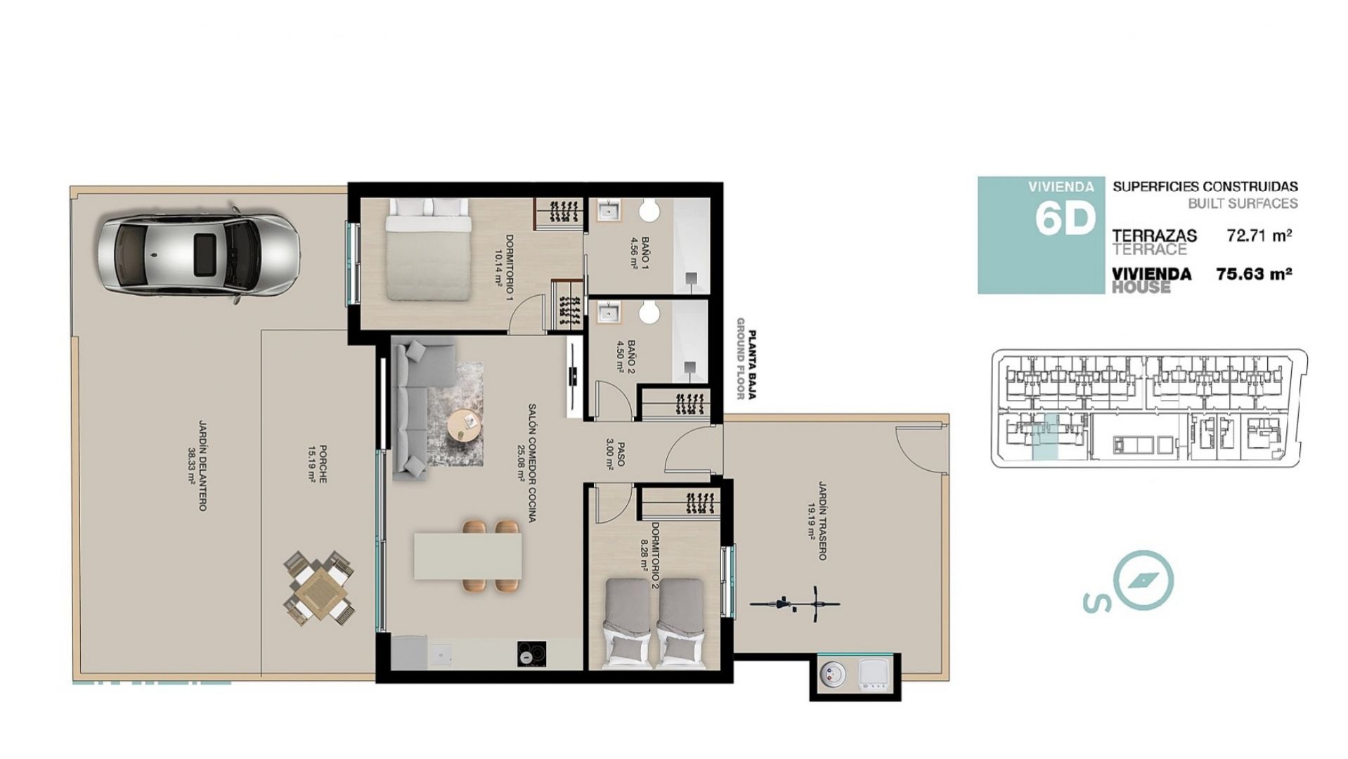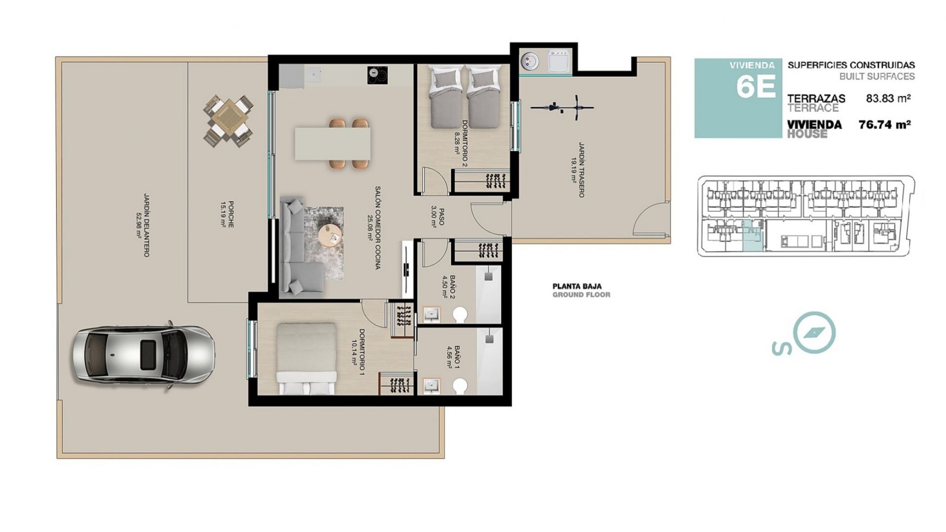 La vivienda dispone de 77 m² de superficie útil, distribuidos en 2 dormitorios y 2 baños, con una distribución cómoda, funcional y muy luminosa. Cuenta además con una terraza de 15 m² y un amplio jardín privado de entre 60 y 125 m², cuidadosamente diseñado y dividido en dos zonas diferenciadas, lo que aporta un valor añadido muy especial. Por un lado, el jardín da a la calle, donde se encuentra la plaza de aparcamiento privada para el coche, y por el otro, el espacio exterior tiene acceso directo a la zona de la piscina comunitaria, creando una conexión perfecta entre la vivienda y las áreas comunes del residencial.