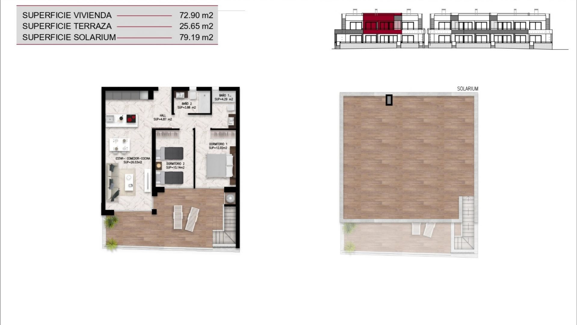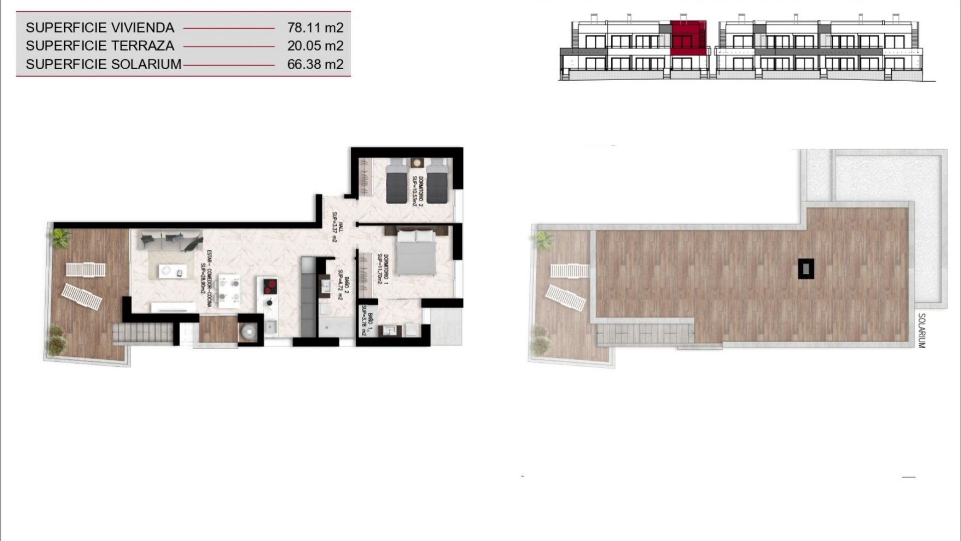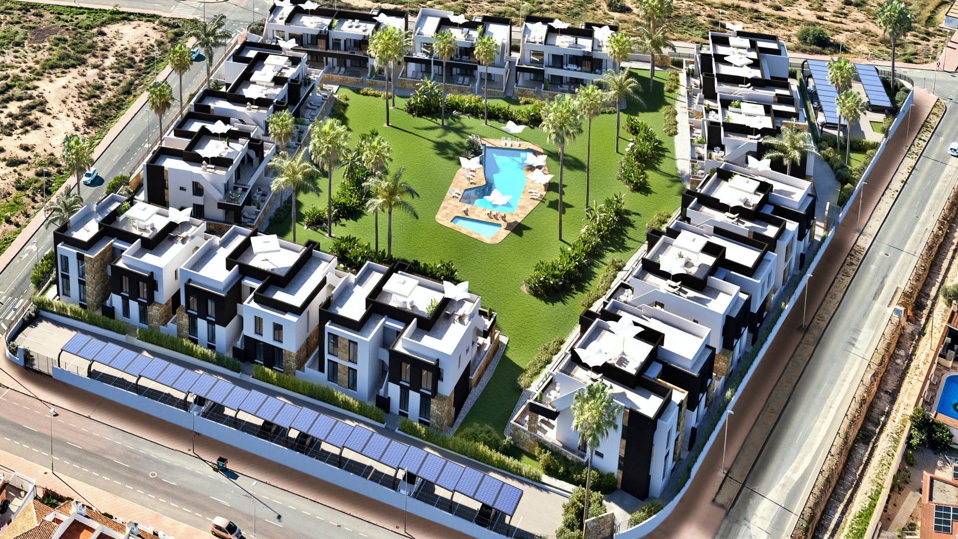 Los bungalós, que cuentan con 2 dormitorios y 2 baños, ofrecen superficies interiores que oscilan entre 72,80 m² y 78,90 m², distribuidos en una sola planta que maximiza la luz natural y el confort. Cada vivienda dispone de una terraza privada de entre 20 m² y 25 m², además de un impresionante solárium en la planta superior que varía entre 66,38 m² y 79,19 m², perfecto para crear un oasis personal al aire libre. Los residentes disfrutarán de la comodidad de plaza de parking y trastero, así como de las amplias zonas ajardinadas, piscina comunitaria y espacios diseñados para el disfrute durante todo el año.