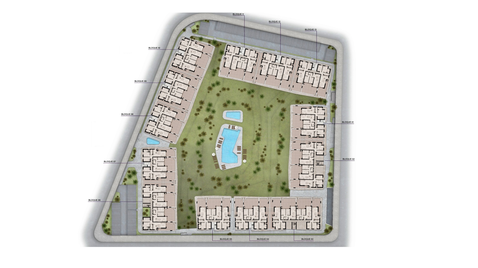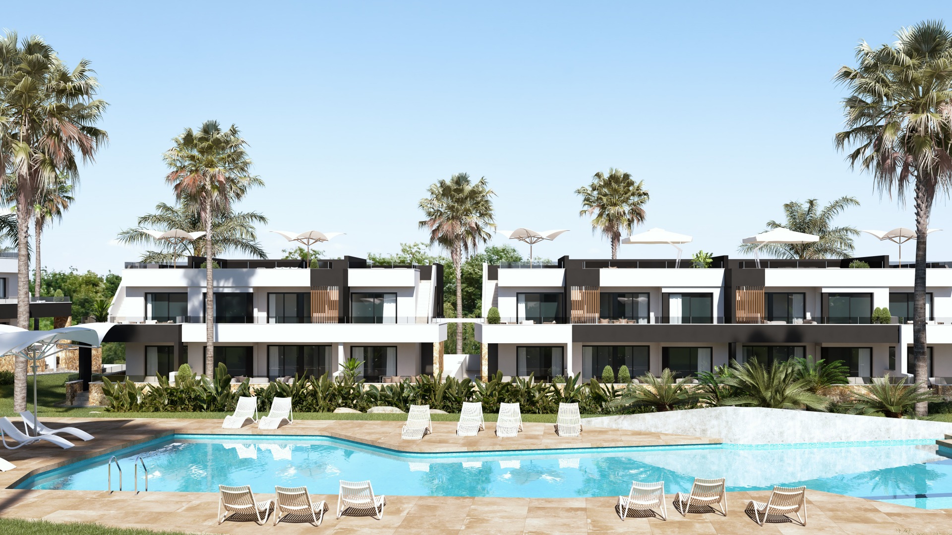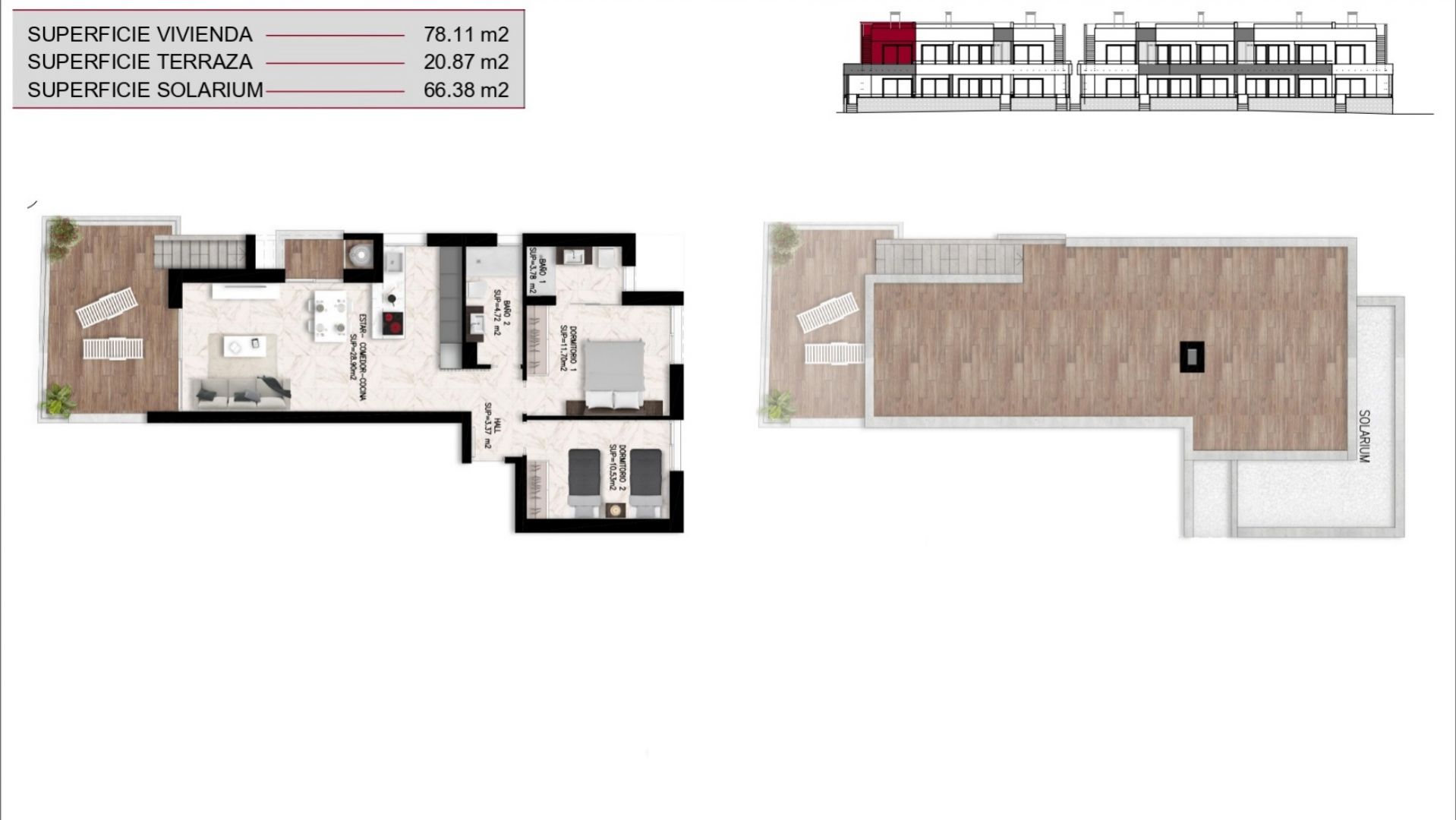 Los bungalós, que cuentan con 2 dormitorios y 2 baños, ofrecen superficies interiores que oscilan entre 72,80 m² y 78,90 m², distribuidos en una sola planta que maximiza la luz natural y el confort. Cada vivienda dispone de una terraza privada de entre 20 m² y 25 m², además de un impresionante solárium en la planta superior que varía entre 66,38 m² y 79,19 m², perfecto para crear un oasis personal al aire libre. Los residentes disfrutarán de la comodidad de plaza de parking y trastero, así como de las amplias zonas ajardinadas, piscina comunitaria y espacios diseñados para el disfrute durante todo el año.