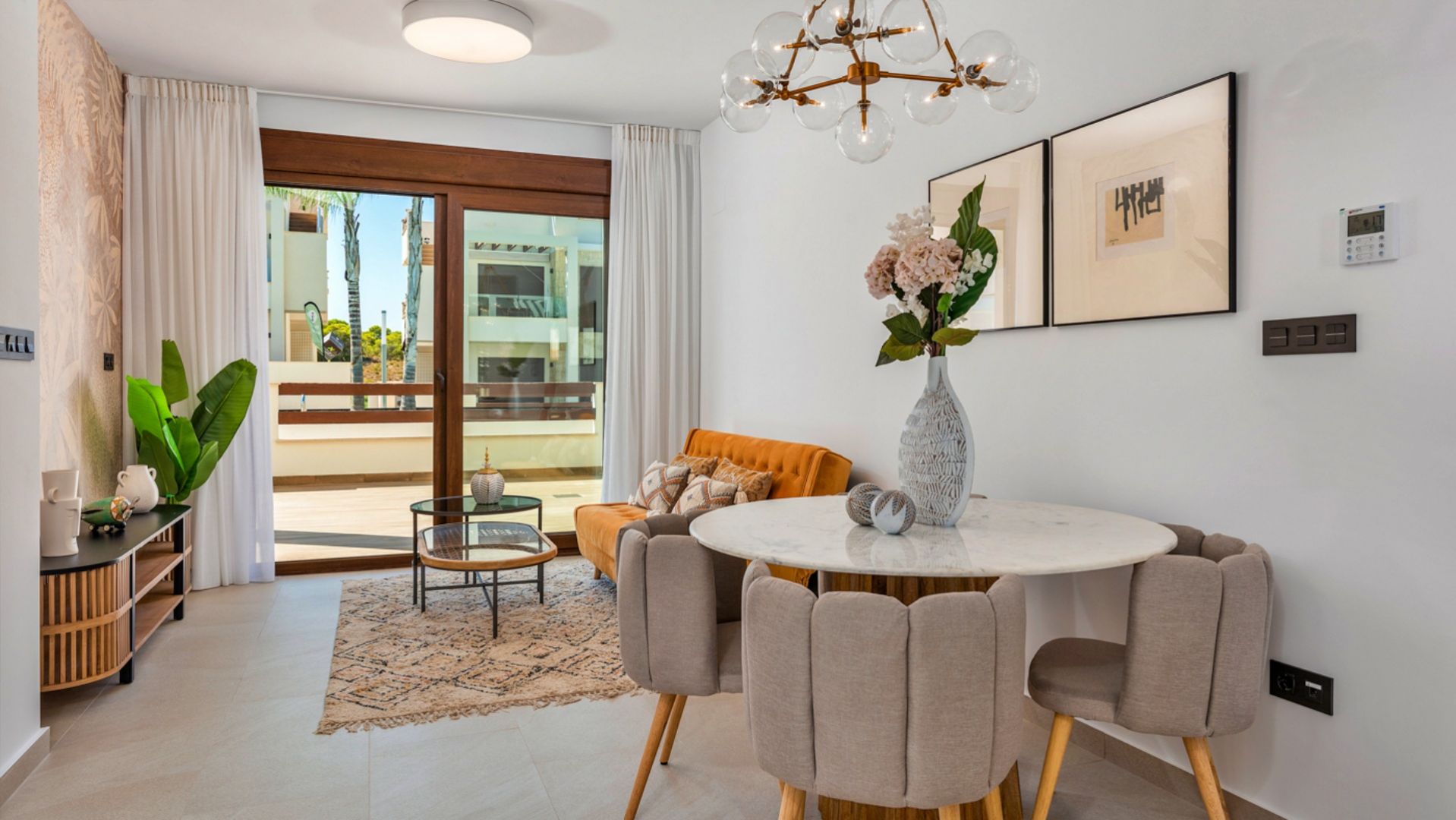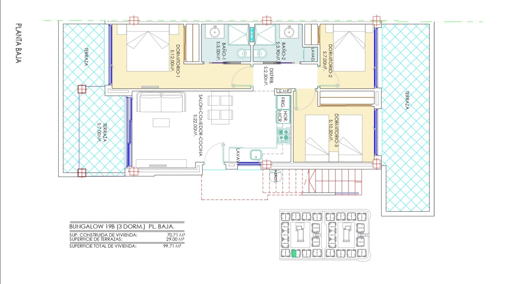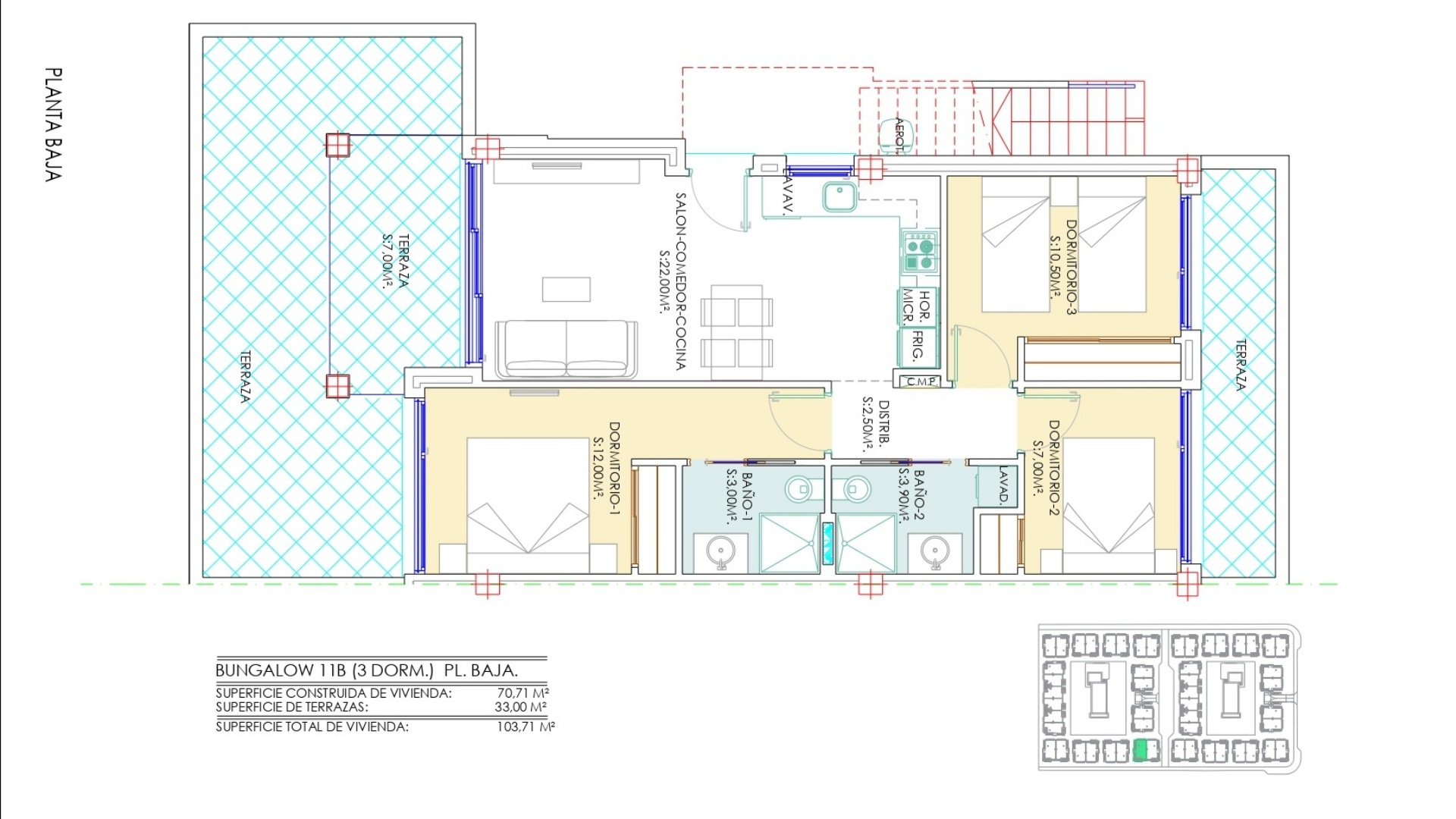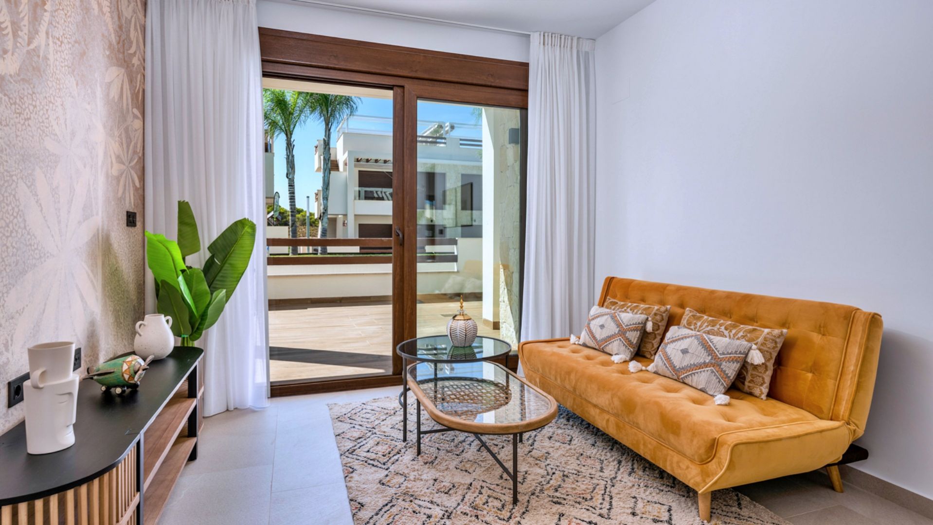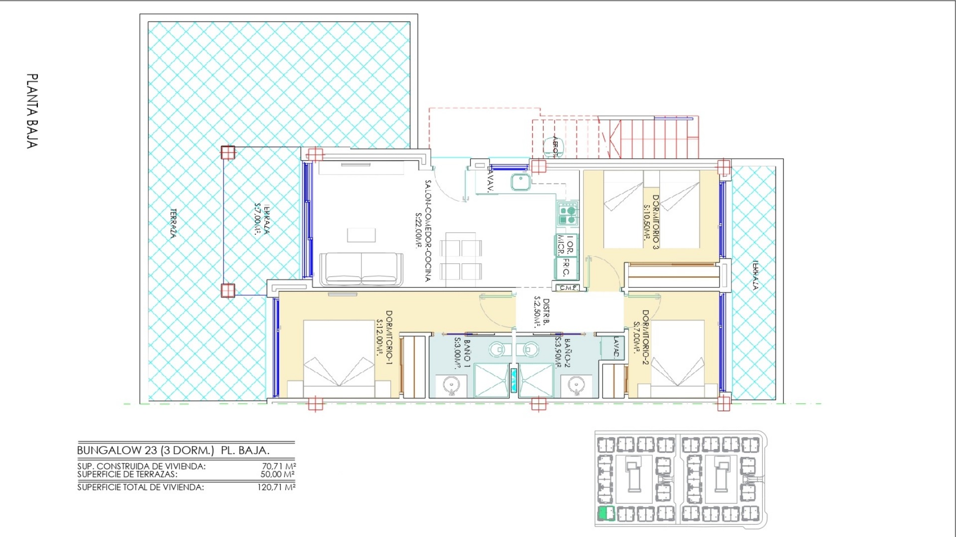 La vivienda cuenta con 3 dormitorios y 2 baños, distribuidos en una superficie interior de 70,71 m² que ha sido cuidadosamente optimizada para ofrecer comodidad y funcionalidad en cada rincón. Además, dispone de amplias terrazas privadas que oscilan entre 30 y 50 m², lo que eleva la superficie total a aproximadamente 100 a 120 m², permitiendo así disfrutar plenamente del estilo de vida al aire libre que caracteriza a esta región. Los grandes ventanales no solo aportan abundante luz natural, sino que también establecen una conexión fluida entre el interior y el exterior, creando un ambiente acogedor y luminoso que invita a la relajación.