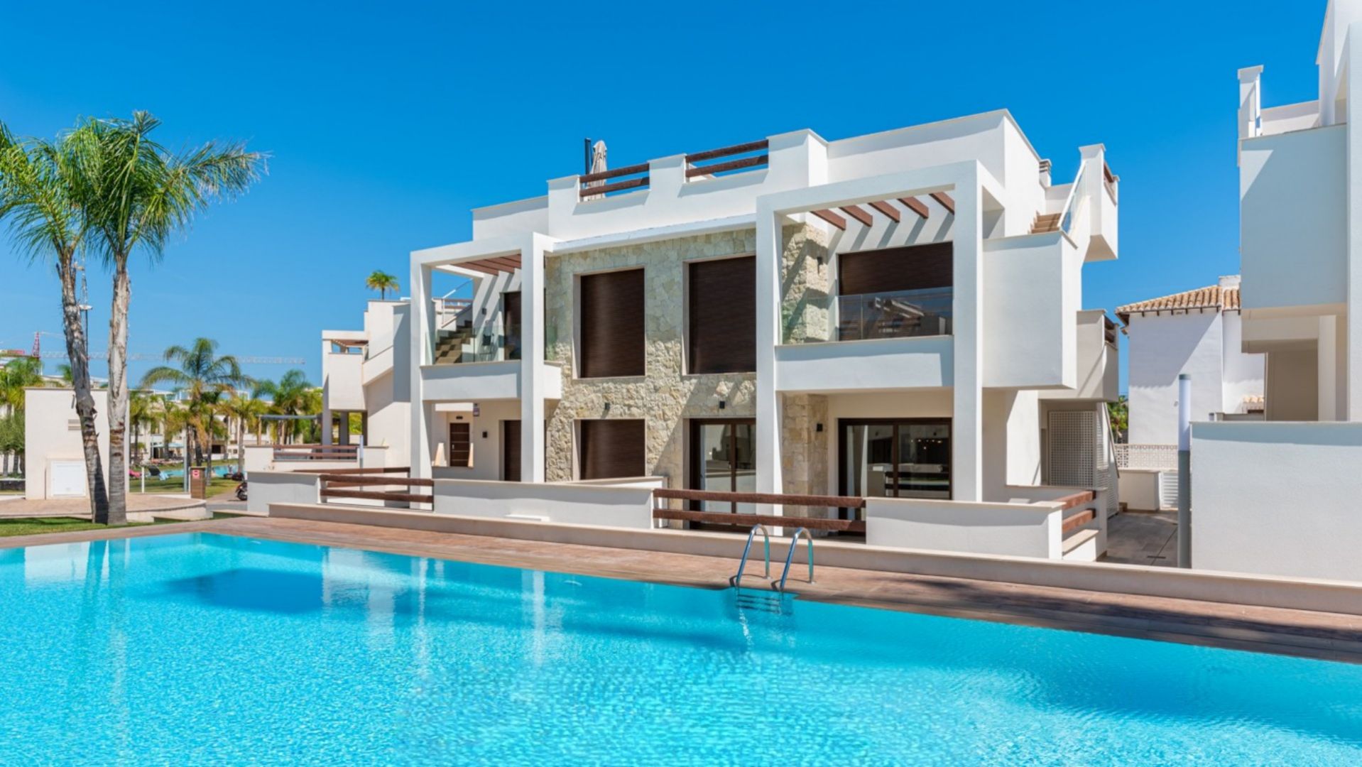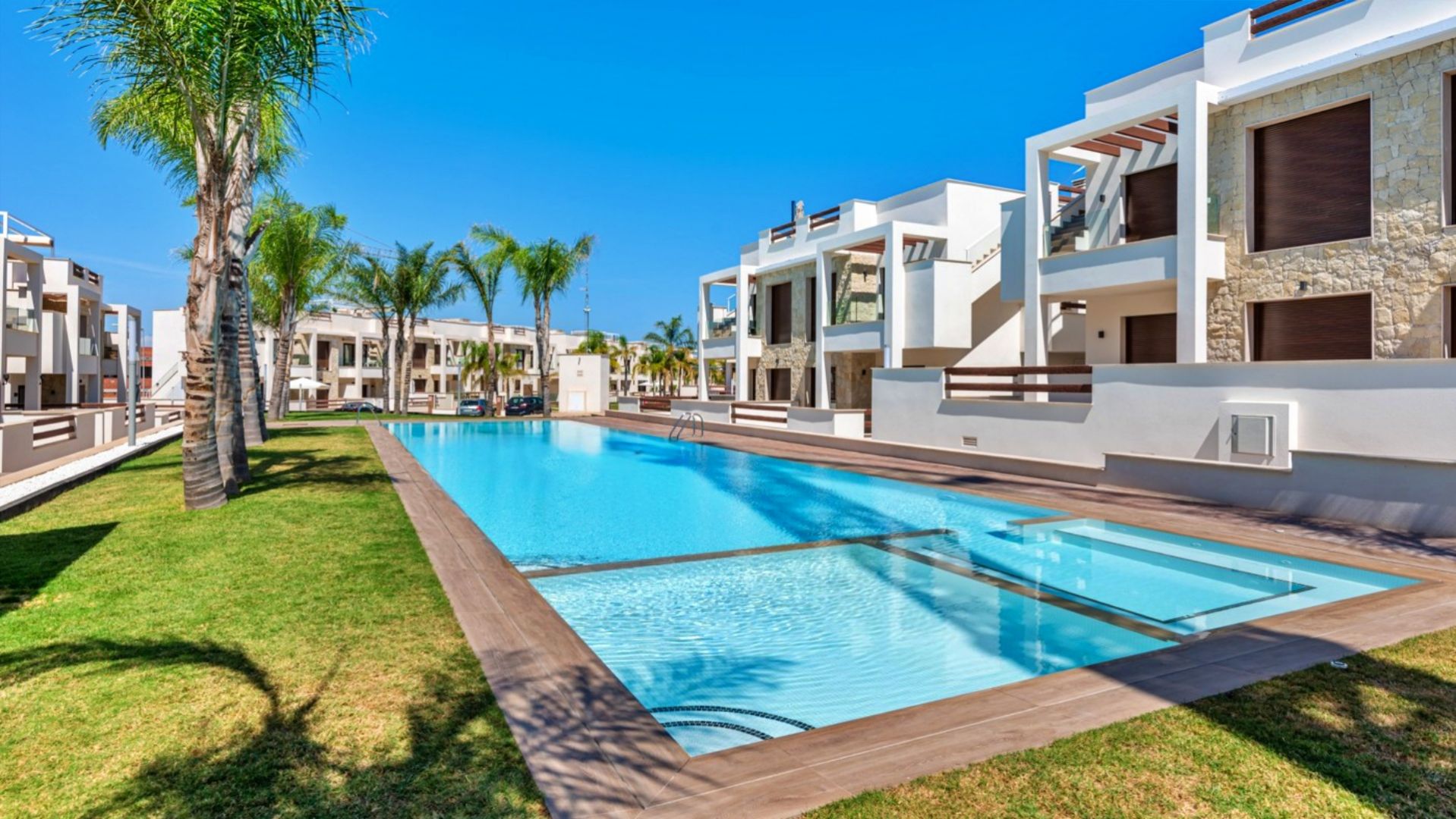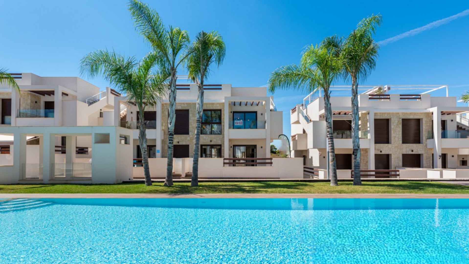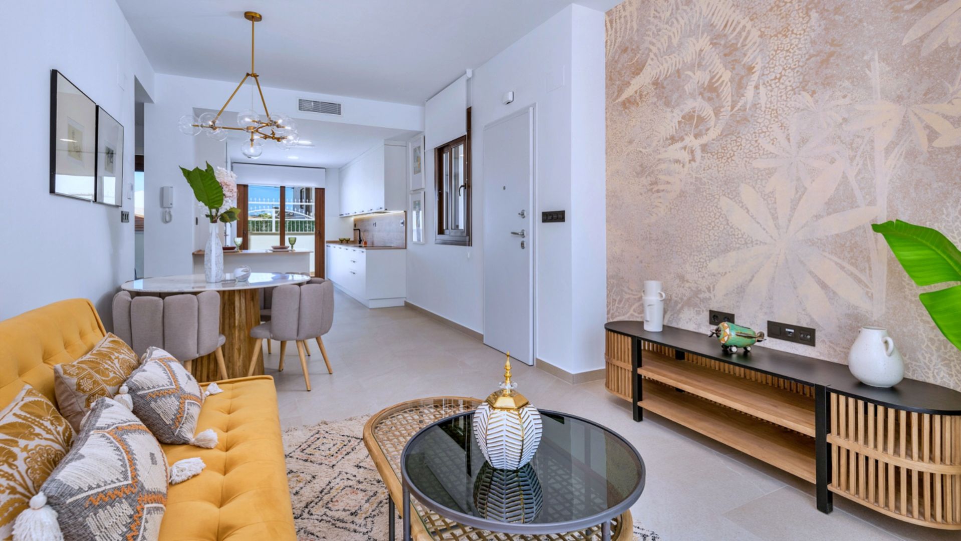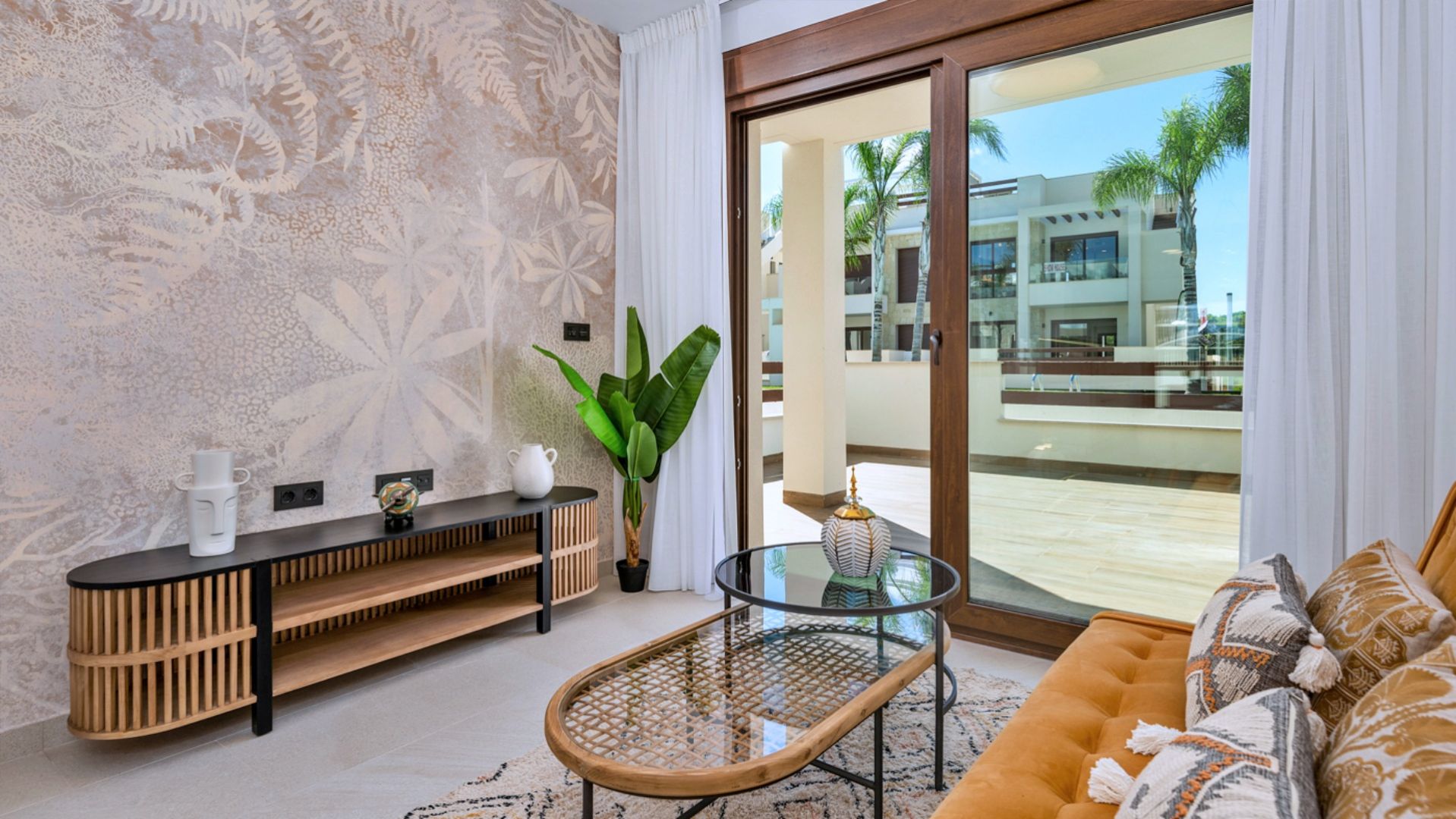 La propiedad cuenta con 2 dormitorios y 2 baños, una superficie construida aproximada de 60 m², y se ubica en planta baja, lo que permite disfrutar de una amplia terraza privada con vistas a las zonas verdes y a las dos grandes piscinas comunitarias. Gracias a la orientación y al clima mediterráneo, el espacio exterior se convierte en una prolongación natural del salón, ideal para desayunos al sol o veladas al aire libre durante todo el año.