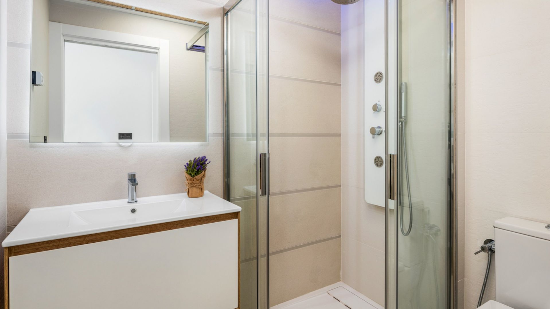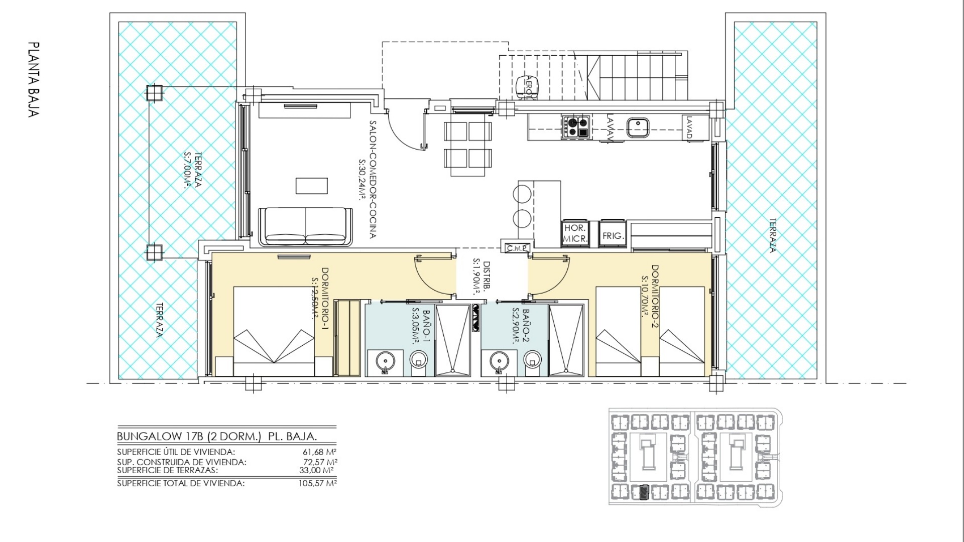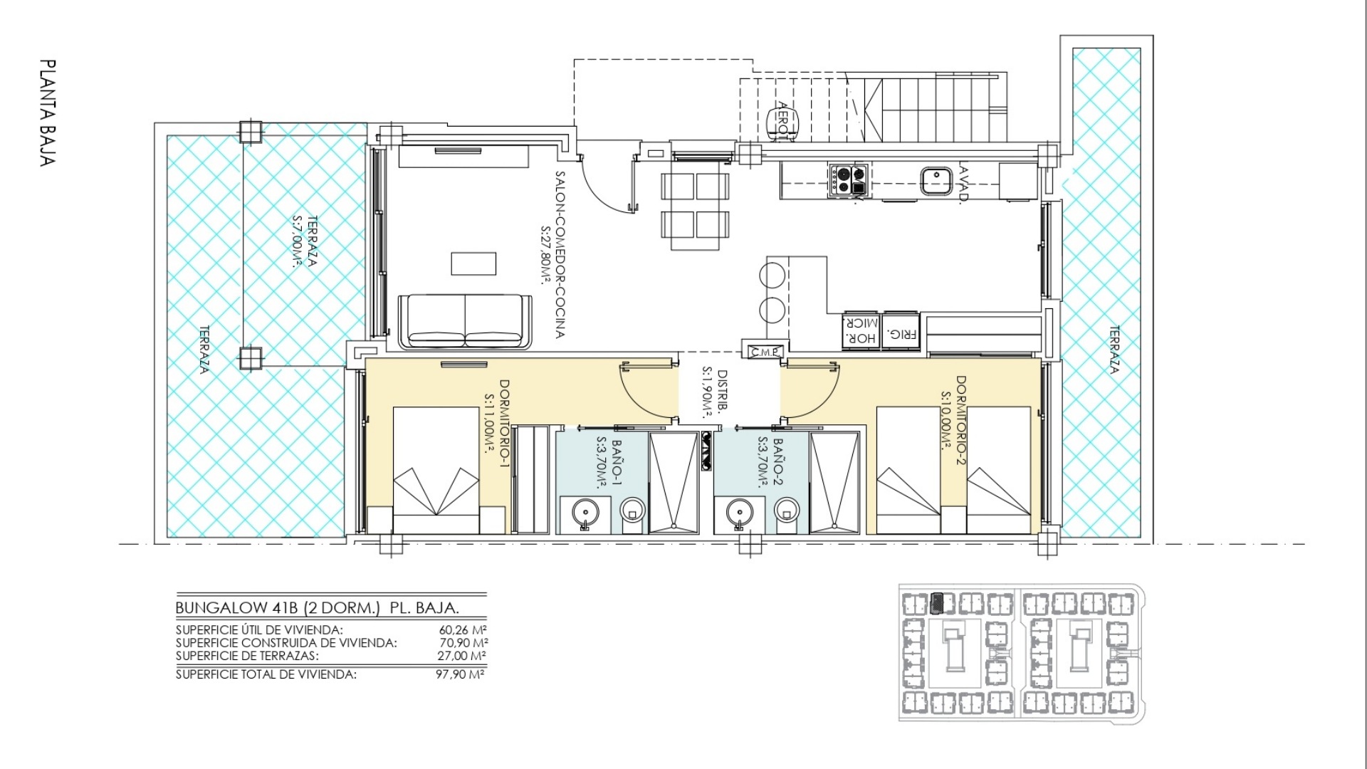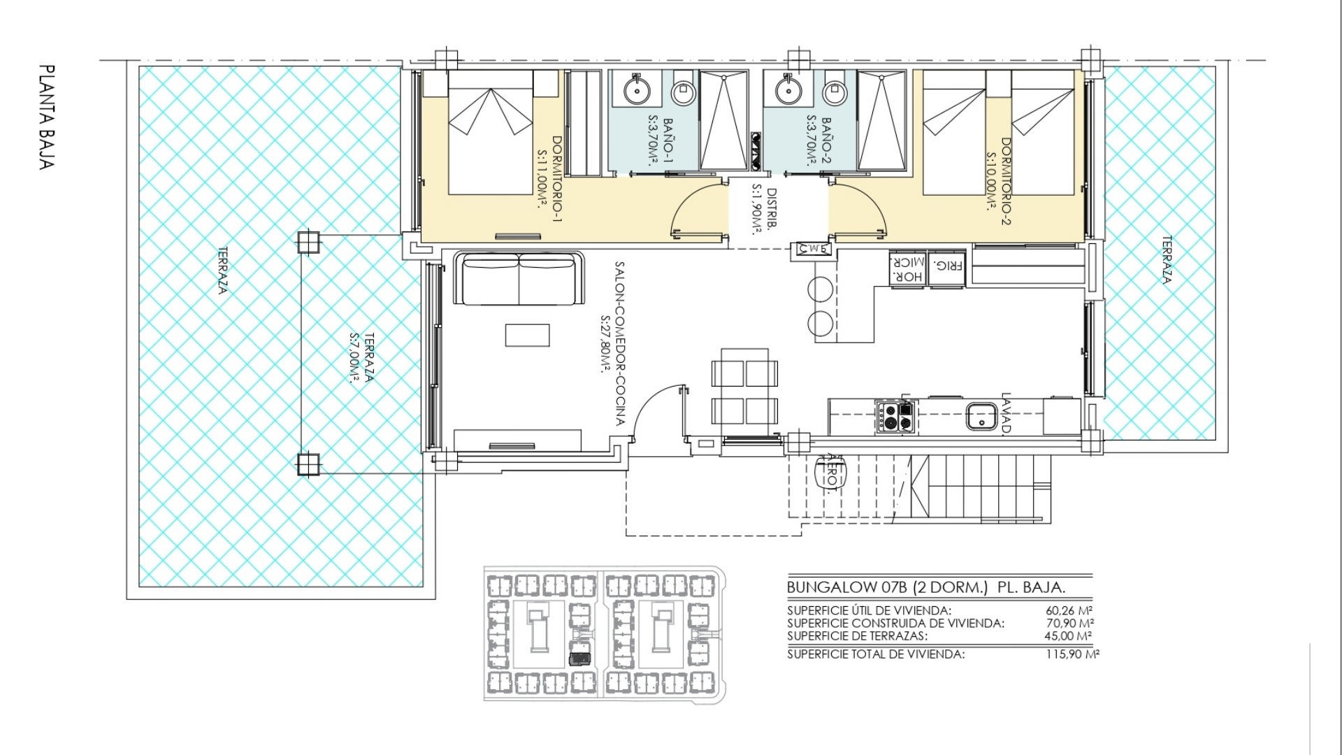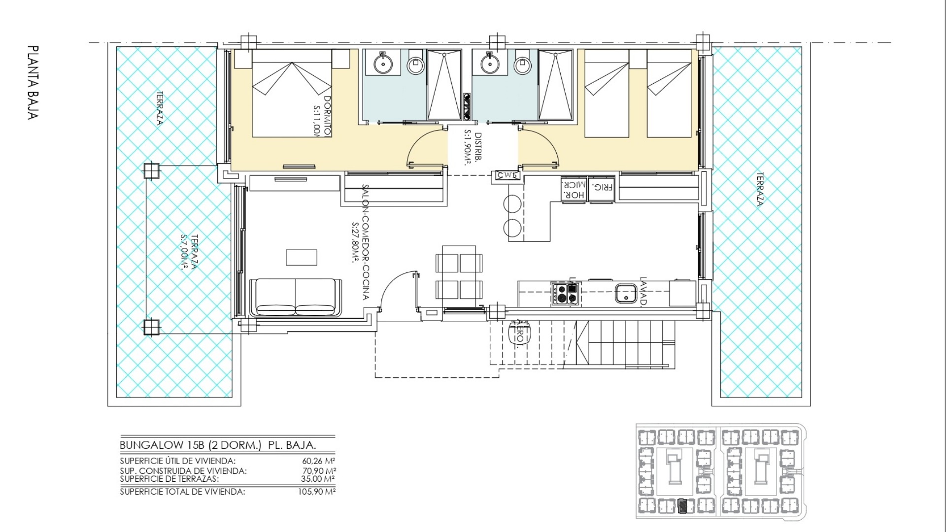 La propiedad cuenta con 2 dormitorios y 2 baños, una superficie construida aproximada de 60 m², y se ubica en planta baja, lo que permite disfrutar de una amplia terraza privada con vistas a las zonas verdes y a las dos grandes piscinas comunitarias. Gracias a la orientación y al clima mediterráneo, el espacio exterior se convierte en una prolongación natural del salón, ideal para desayunos al sol o veladas al aire libre durante todo el año.