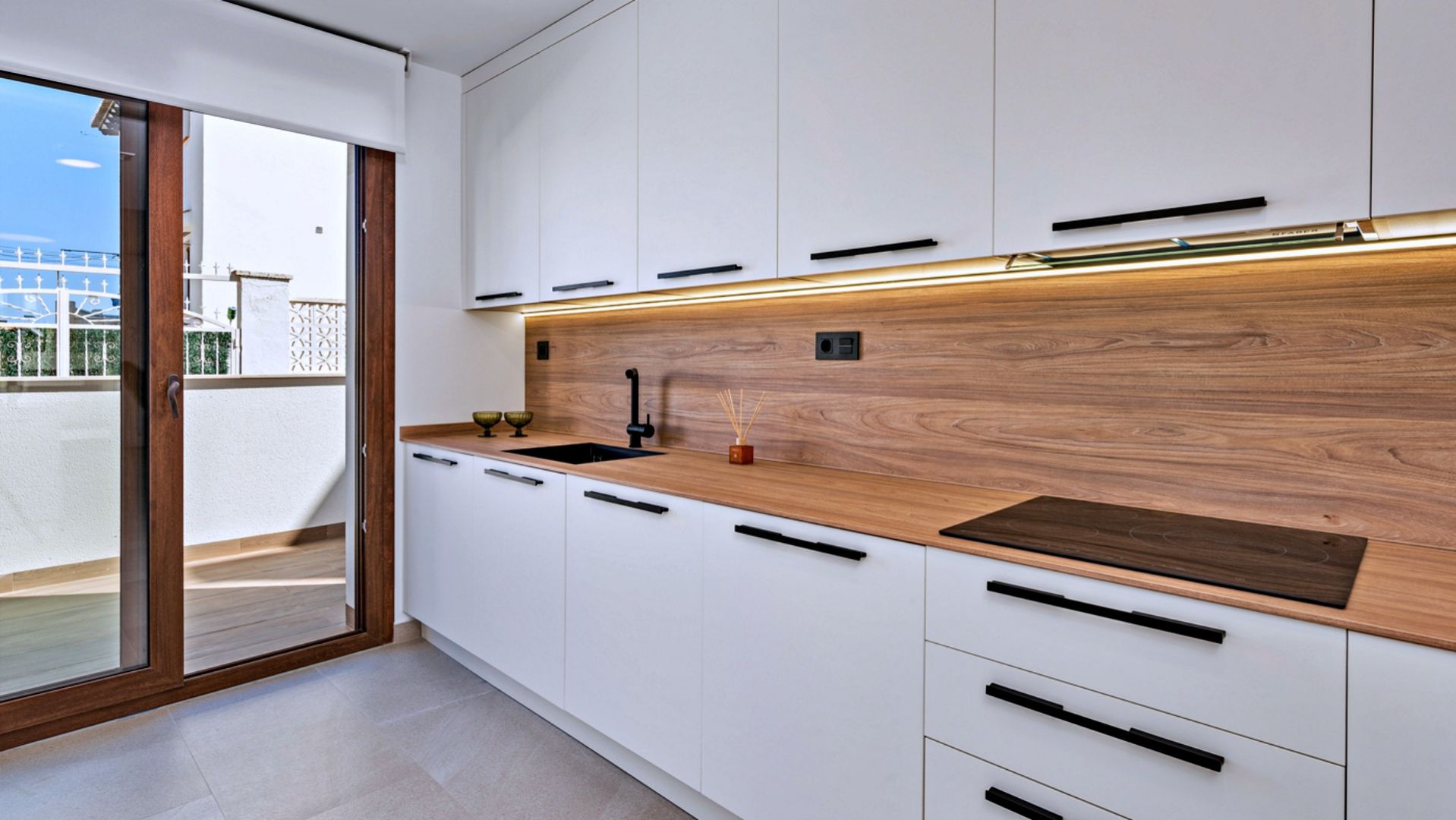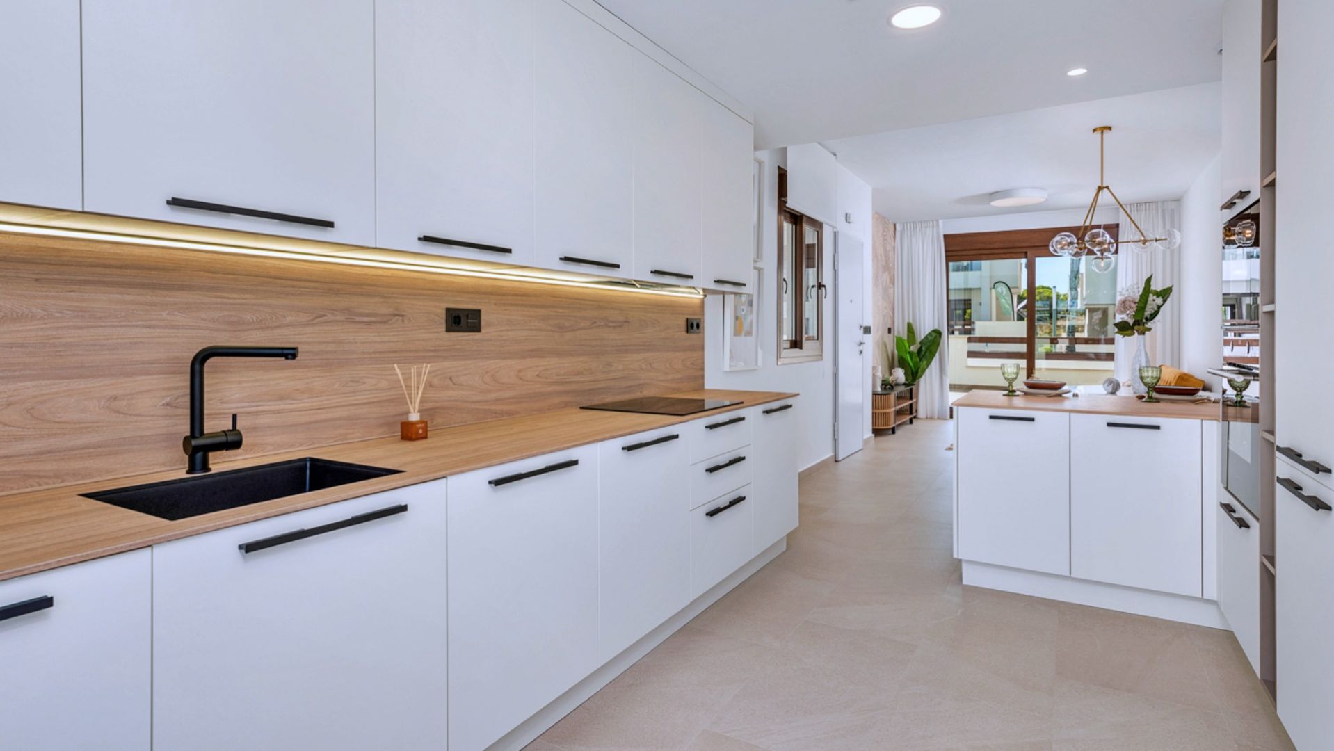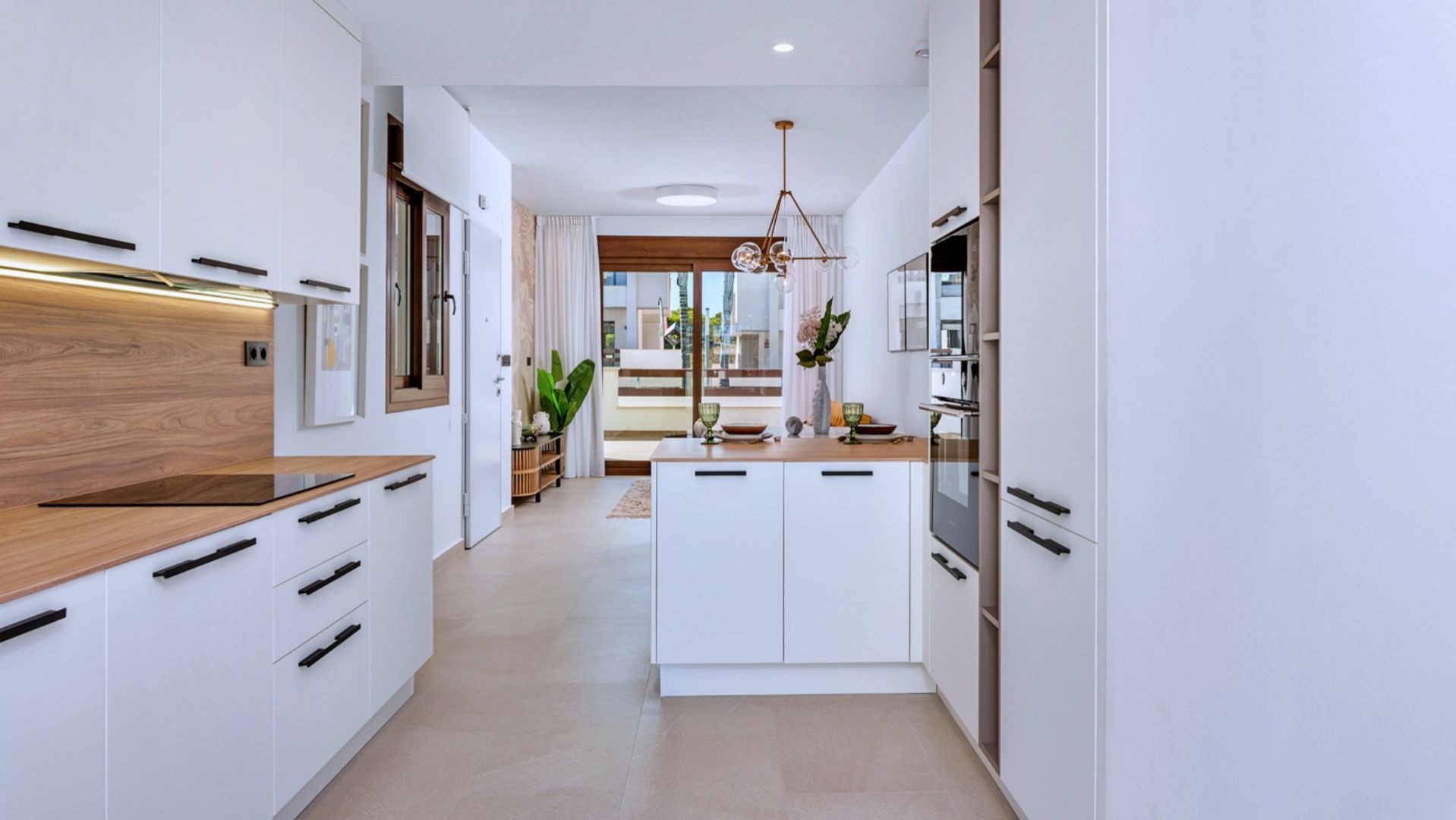 En el interior encontramos un diseño moderno y funcional con cocina americana abierta, salón-comedor luminoso con grandes ventanales que conectan con la terraza, dormitorios confortables y baños con acabados actuales. Los materiales utilizados son de primera calidad, siguiendo un concepto contemporáneo y elegante.