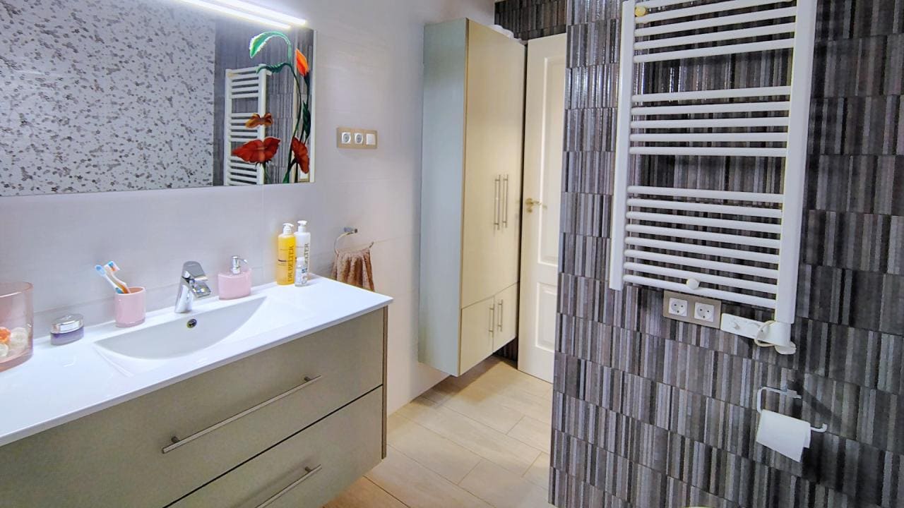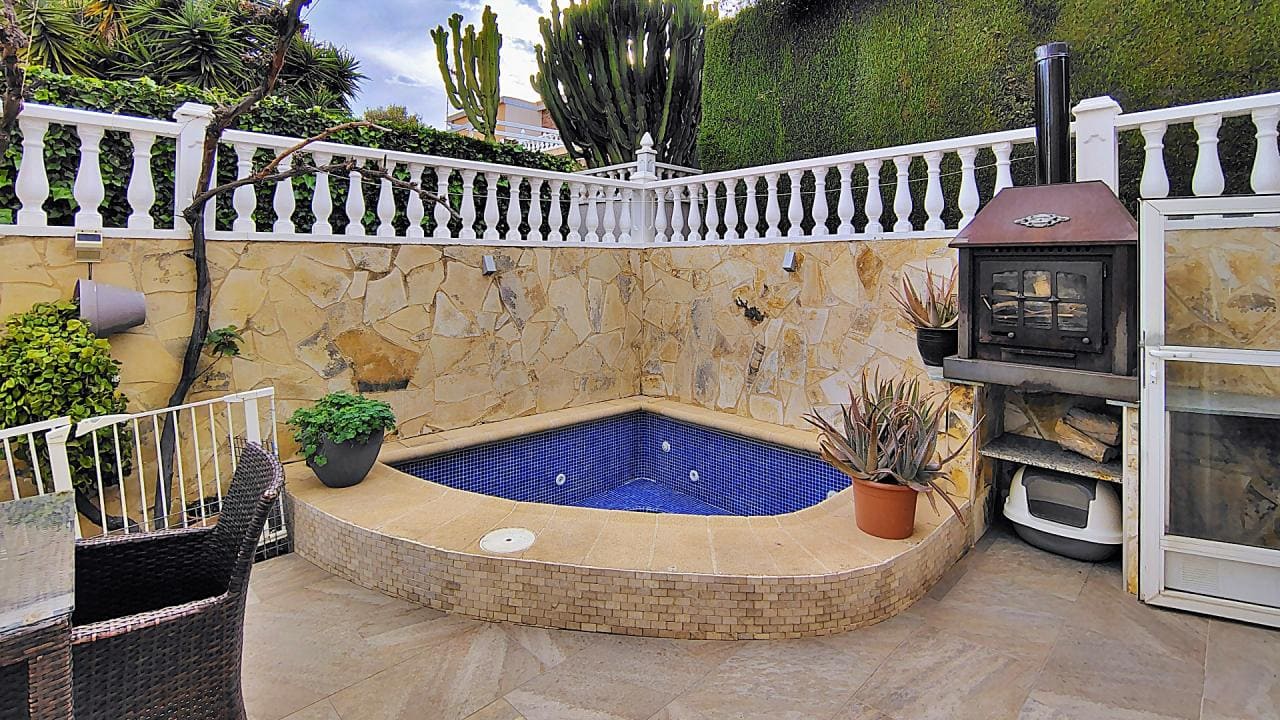 El salón-comedor se conecta a una cocina con iluminación LED, que añade un toque contemporáneo a la casa. En el exterior, podrás disfrutar de un gran jardín privado que incluye un jacuzzi, ideal para relajarse en cualquier momento del día. Además, la vivienda cuenta con un solárium con impresionantes vistas al mar, perfecto para disfrutar del clima soleado de la Costa Blanca.