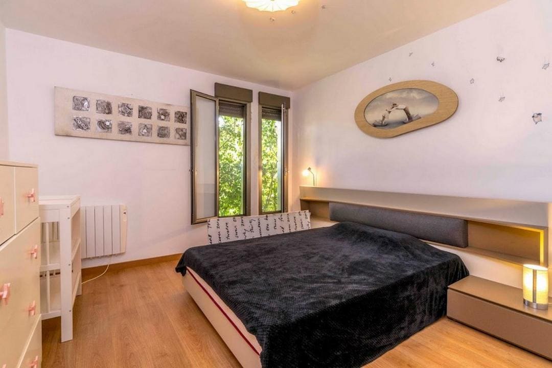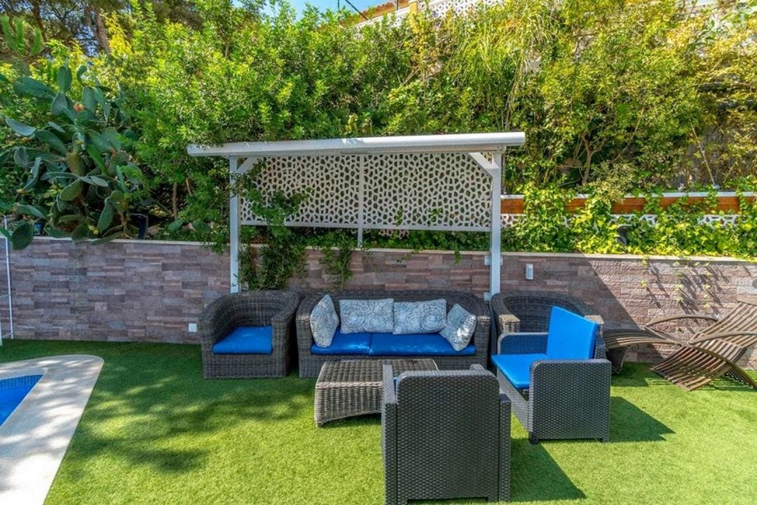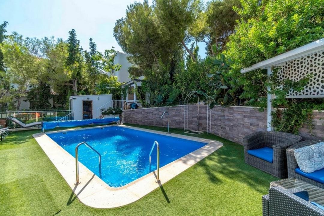 La parcela detrás de la casa es un oasis de relax y entretenimiento, con una piscina privada rodeada de una zona de descanso con cómodos sofás, una zona de barbacoa perfecta para reuniones al aire libre y una sauna al aire libre para disfrutar de momentos de bienestar y tranquilidad.