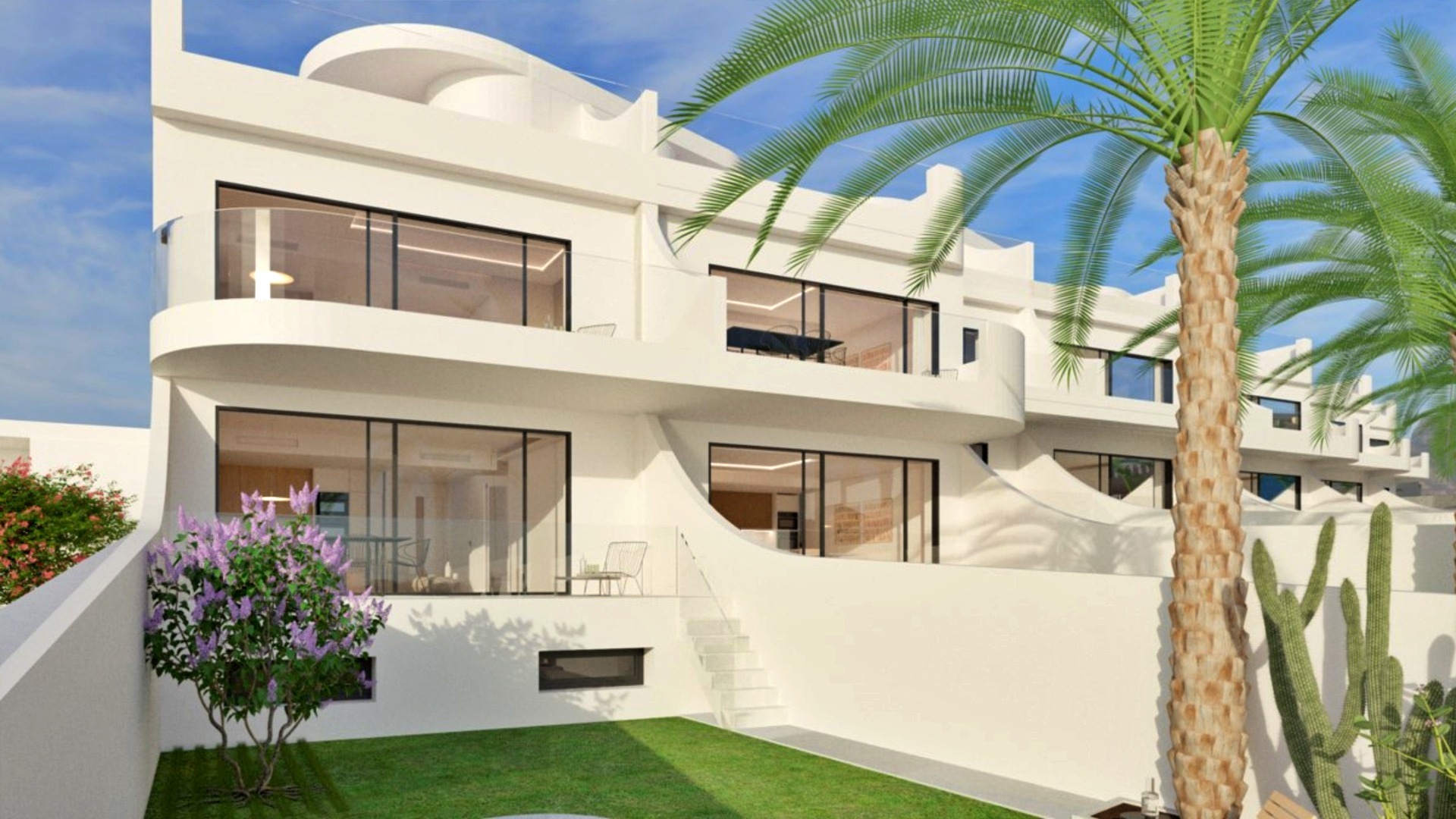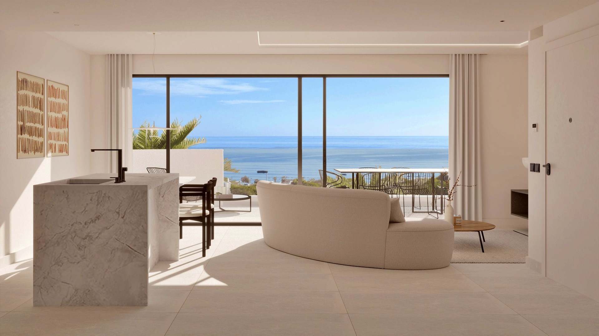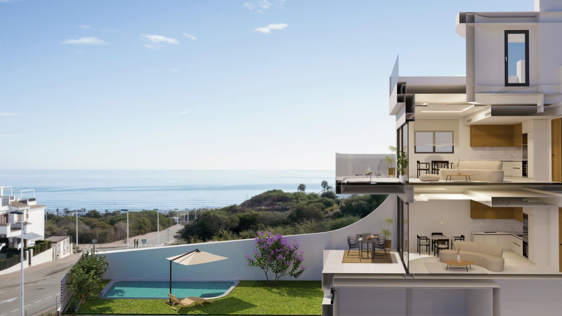 La promoción ofrece diferentes tipologías pensadas para responder a distintas necesidades. Los apartamentos en planta baja disponen de un gran jardín privado con vistas al mar y espacio suficiente para la posible instalación de una piscina privada, además de un semisótano que permite añadir dormitorios adicionales o zonas polivalentes. Los áticos destacan por su amplio balcón, solárium privado y espectaculares vistas al mar, ideales para disfrutar del sol y del estilo de vida mediterráneo con total privacidad.
