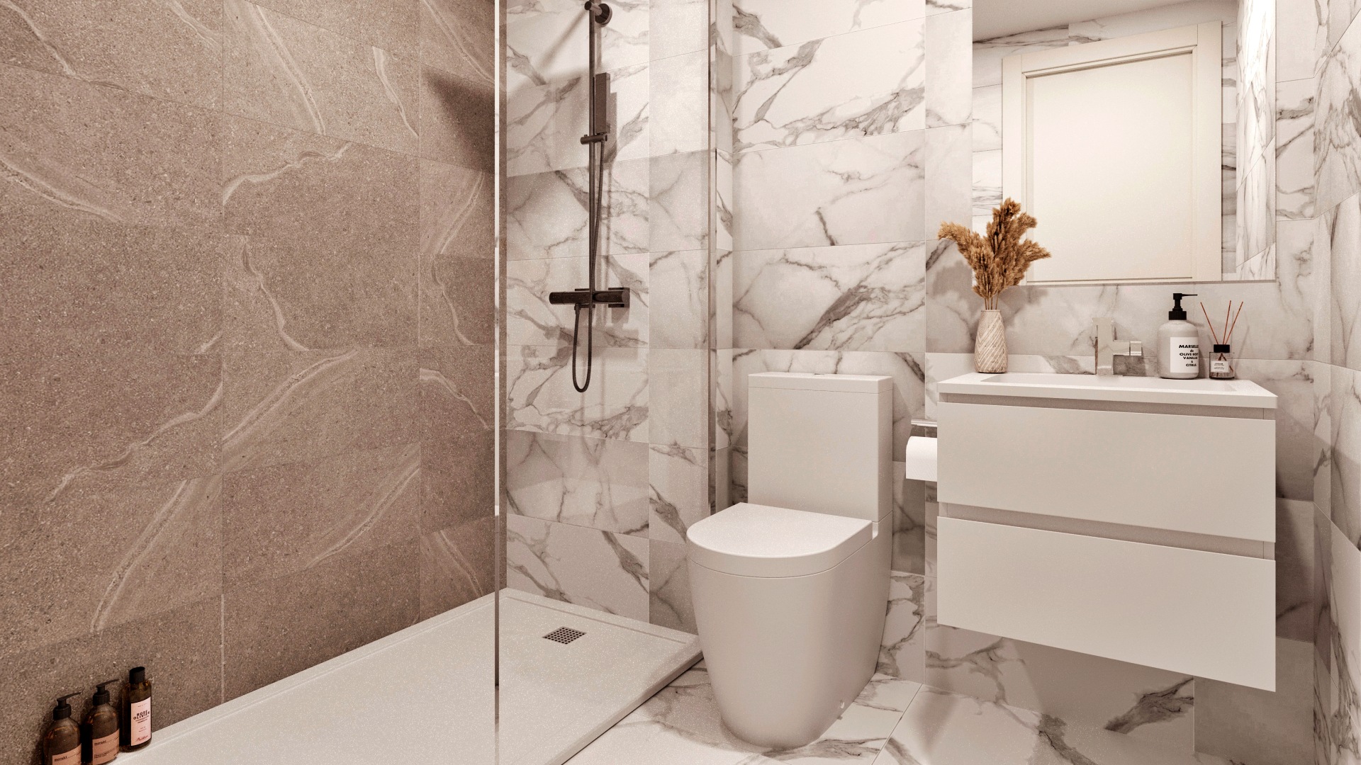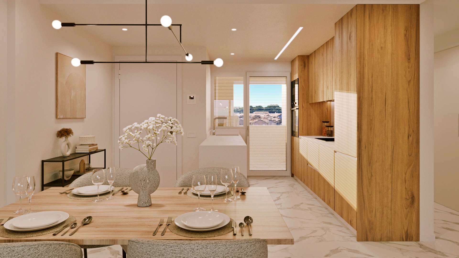 Las viviendas destacan por sus excelentes calidades: estructura de hormigón armado, fachadas modernas con cerramientos de alta eficiencia térmica y acústica, carpintería exterior en PVC con rotura de puente térmico, doble acristalamiento tipo Climalit, persianas motorizadas en dormitorios y barandillas de vidrio. En el interior, cuentan con suelo porcelánico de gran formato, pintura lisa, puertas lacadas, armarios empotrados totalmente equipados y puerta de entrada acorazada. Las cocinas se entregan completamente equipadas con mobiliario alto y bajo, encimeras tipo Corian, electrodomésticos integrados de alta gama y un diseño moderno y funcional. Los baños disponen de sanitarios suspendidos, platos de ducha de resina con mamparas de cristal, muebles de lavabo, espejos y suelo radiante eléctrico, aportando un extra de confort. El sistema de climatización y agua caliente se realiza mediante aerotermia de alta eficiencia, con distribución por conductos y control mediante termostato. La vivienda incorpora además videoportero, preinstalación para domótica, iluminación en terrazas, cocina y baños, y completas instalaciones de telecomunicaciones.