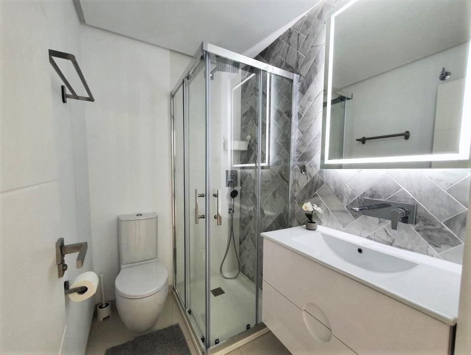 El apartamento consta de 2 dormitorios, 2 baños, salón, cocina y una bonita terraza con comedor equipado con vistas a la piscina y al mar, y una terraza con tumbonas con vistas a la ciudad y al mar. Los apartamentos tienen un sistema de aire acondicionado, muebles y artículos de decoración cuidadosamente seleccionados, una cocina funcional equipada con horno, microondas, lavavajillas y lavadora.