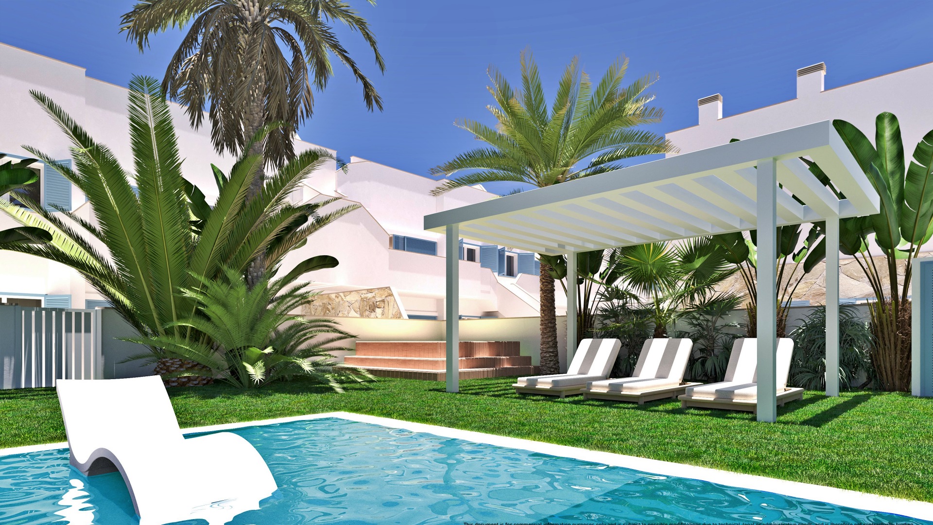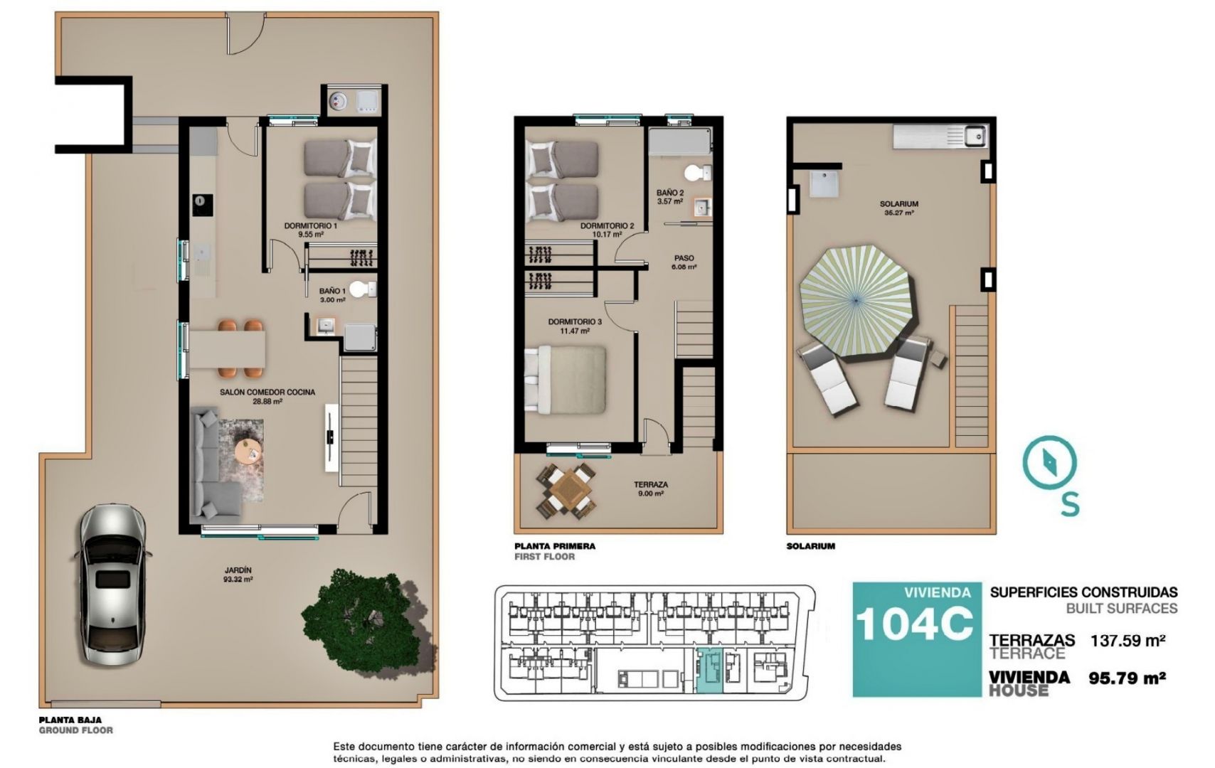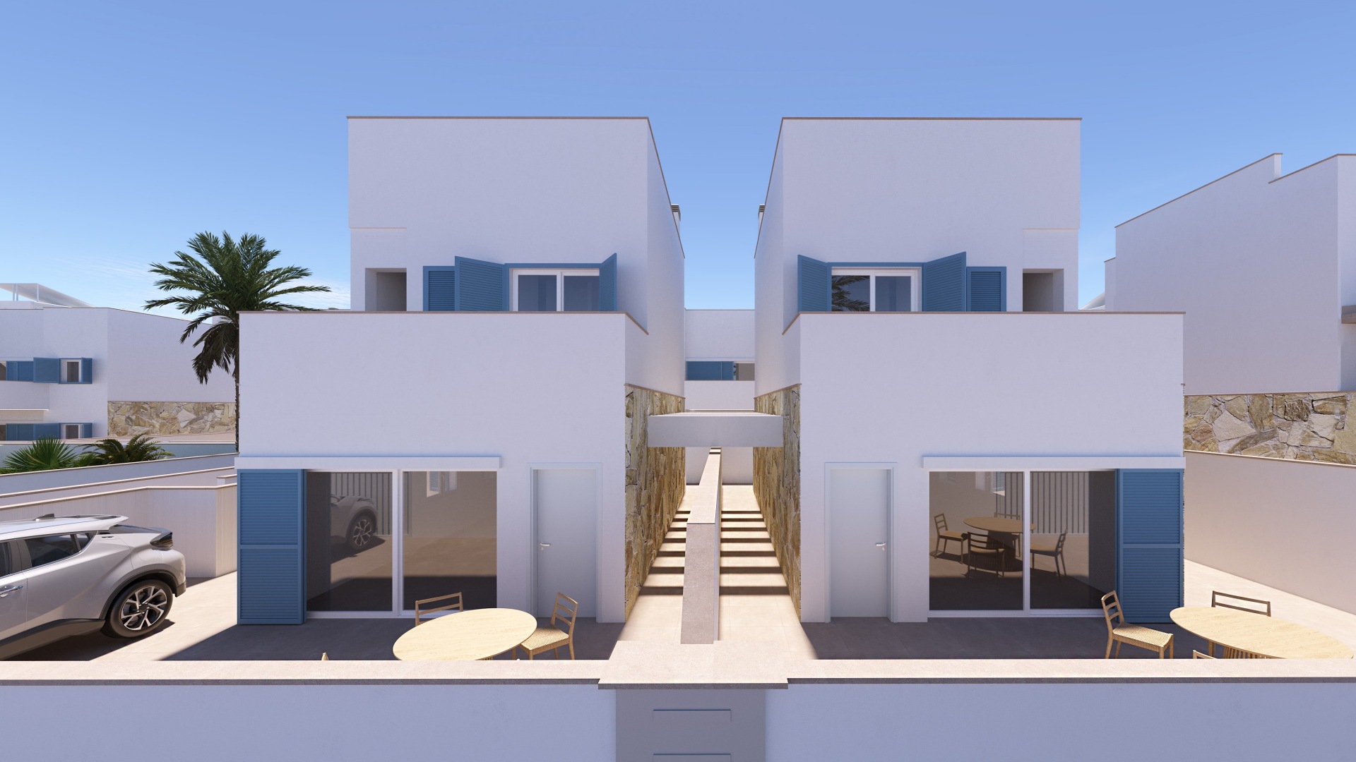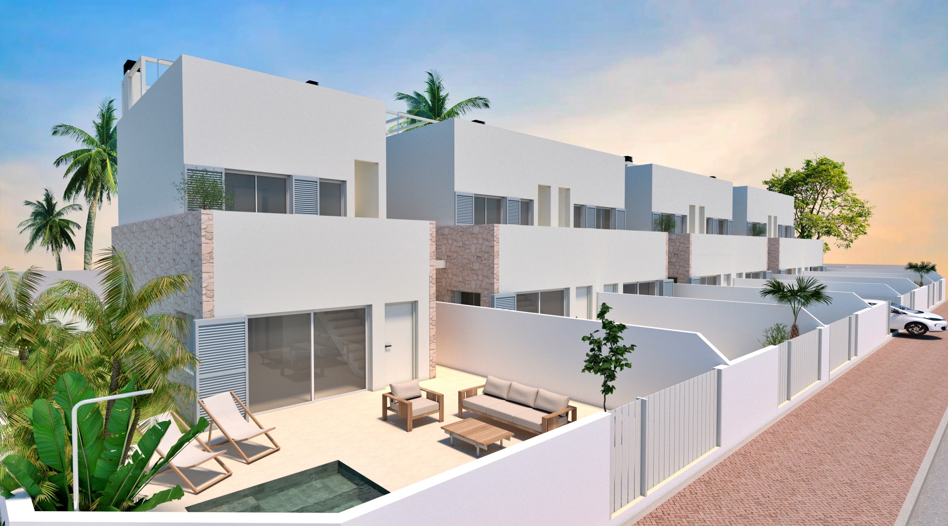 La villa dispone de 96 m² de superficie interior y 137 m² construidos incluyendo terrazas, con una distribución funcional y luminosa. Se sitúa sobre una parcela privada de 138 m², ideal para disfrutar del exterior, organizar comidas al aire libre o crear una zona chill out privada bajo el sol mediterráneo. El diseño arquitectónico es contemporáneo, con líneas limpias y grandes ventanales que conectan los espacios interiores con las terrazas. El salón es amplio y luminoso, las habitaciones ofrecen comodidad y privacidad, y los baños presentan un diseño actual con materiales de calidad. La vivienda está equipada con aerotermia para el agua caliente sanitaria y preinstalación de aire acondicionado por conductos, garantizando confort durante todo el año.