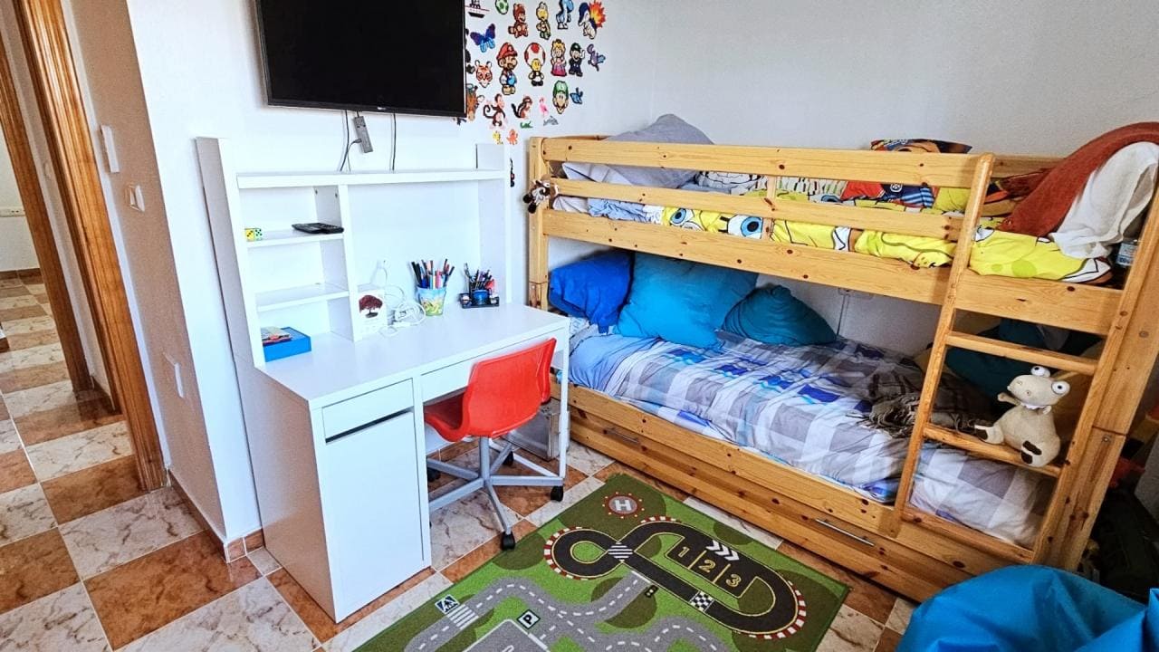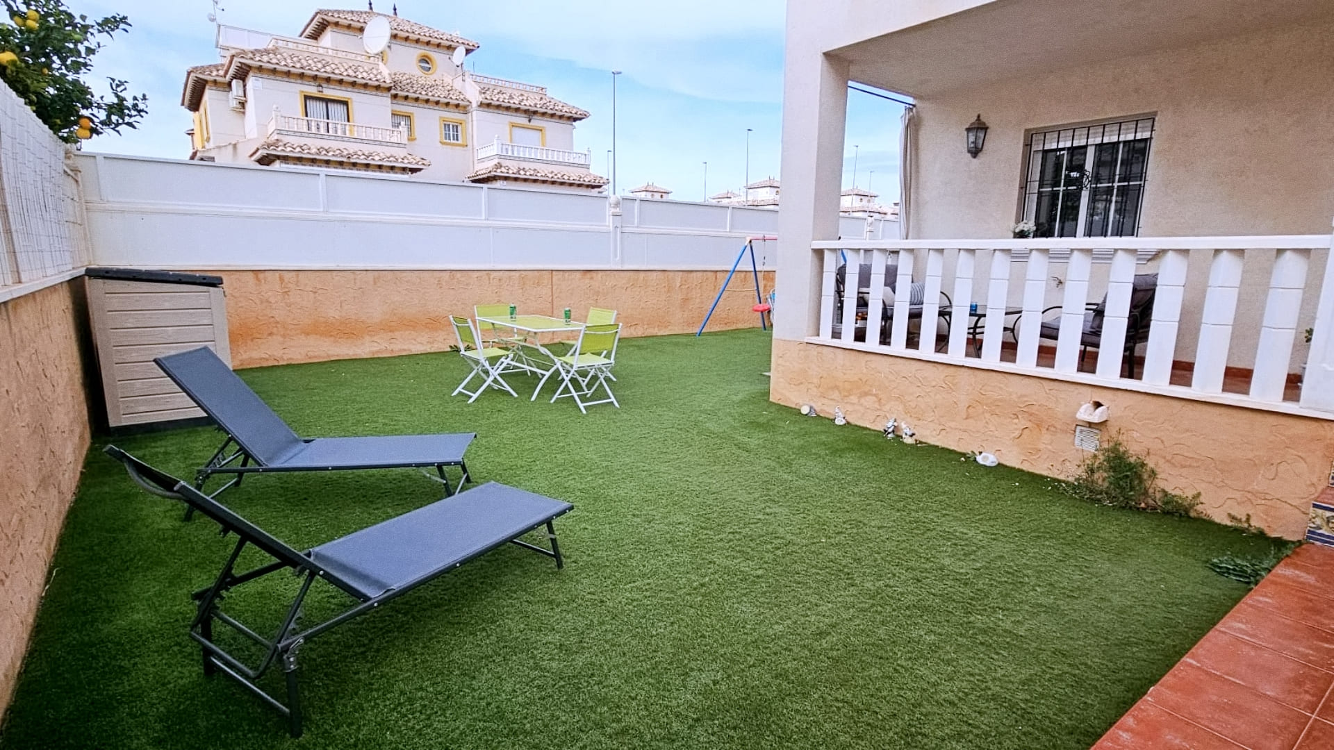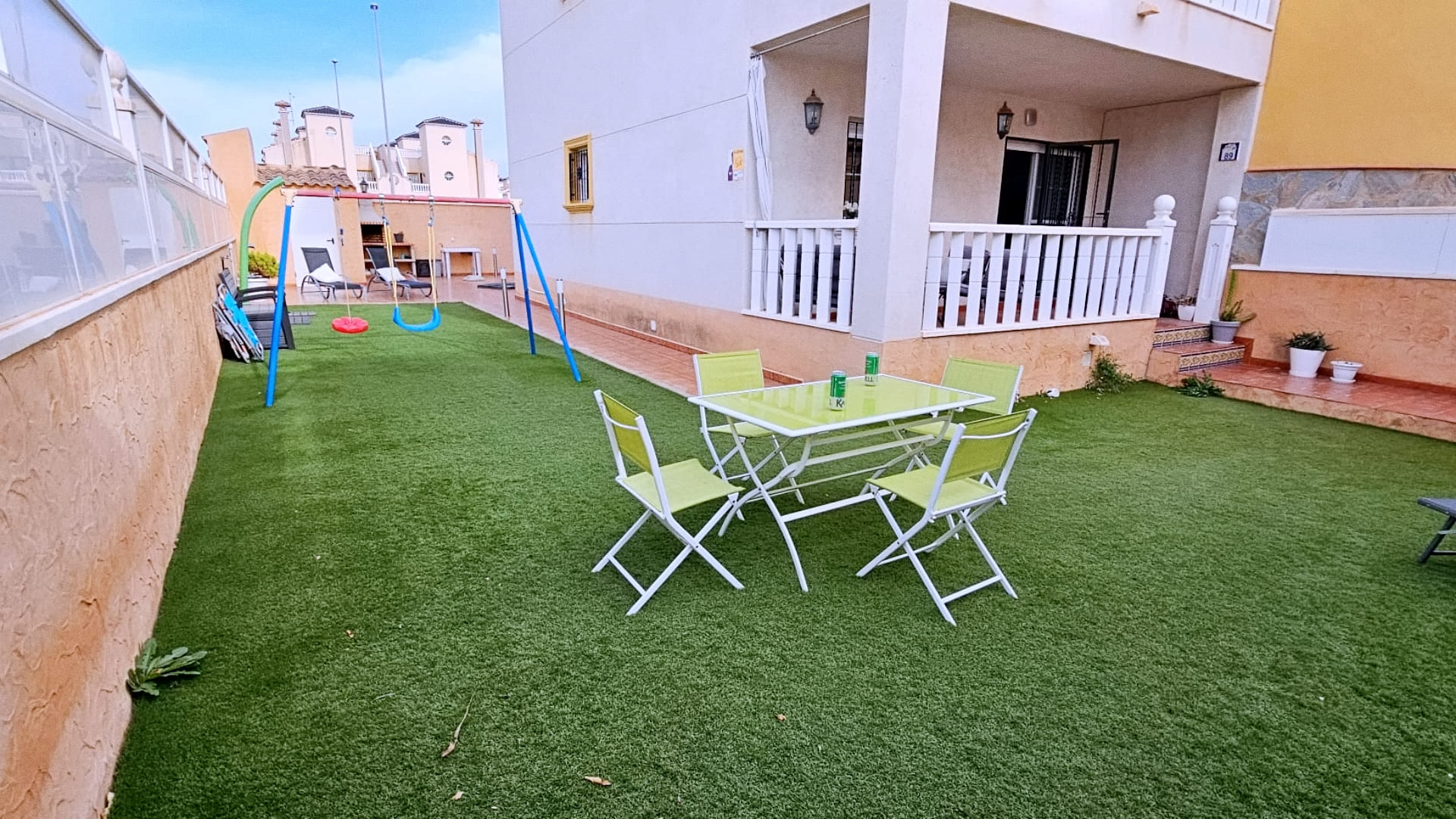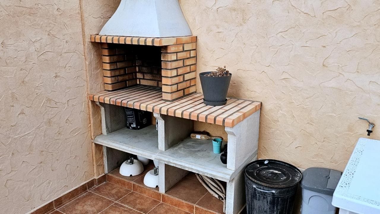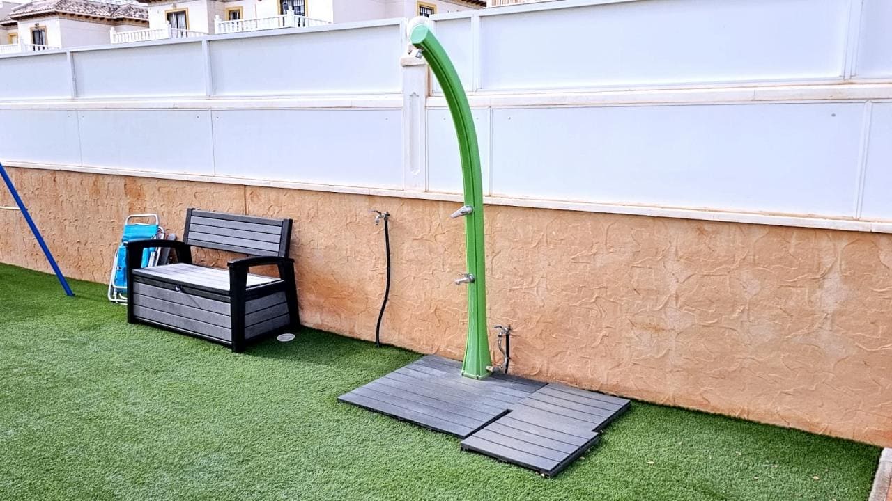 En el exterior, la propiedad cuenta con un gran porche cubierto, que puede cerrarse y convertirse en una nueva habitación, adaptándose a las necesidades de cada familia. El jardín privado de 180 m² es un verdadero paraíso al aire libre, con 80 m² de zona pavimentada que incluye una barbacoa incorporada, perfecta para reuniones y comidas en familia. Además, dispone de 100 m² de césped artificial, ideal para disfrutar del jardín sin complicaciones de mantenimiento, una ducha solar para refrescarse, farolas que iluminan el espacio exterior y un amplio trastero para almacenamiento adicional. Gracias a las tres orientaciones del jardín, podrás aprovecharlo durante todo el año, disfrutando del sol y del clima mediterráneo.