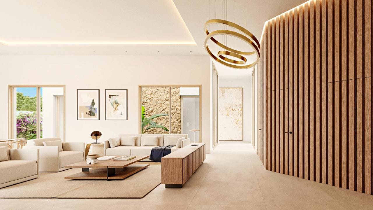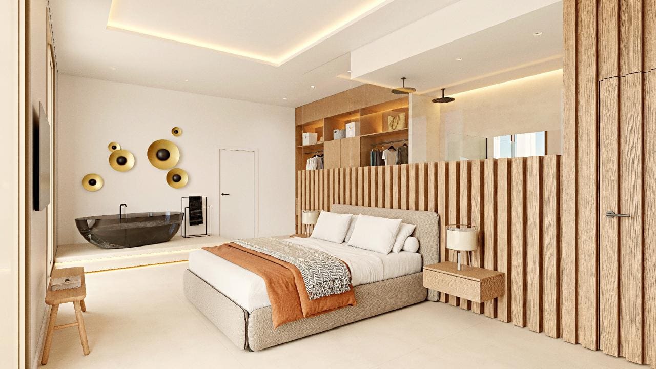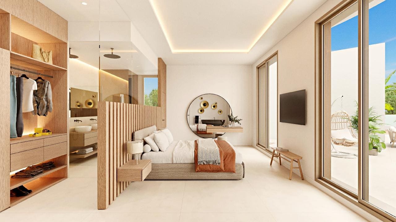 La vivienda está diseñada para el máximo confort y elegancia. Cuenta con 4 amplios dormitorios con vestidores, cada uno con su propio baño en suite equipado con suelo radiante. La cocina, de diseño abierto y contemporáneo con una mesa isla central, se integra perfectamente con el salón. Los grandes ventanales aseguran que la luz natural inunde el espacio y proporcionan vistas inigualables de la extensa propiedad.