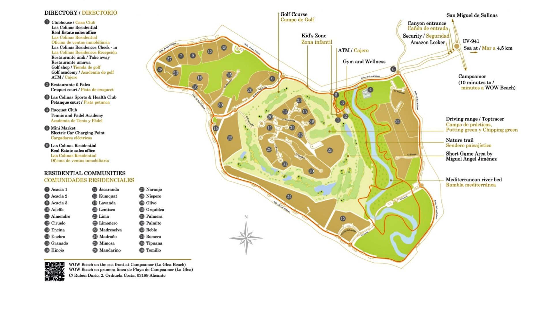 Las Colinas Golf & Country Club ofrece un entorno incomparable con campo de golf de campeonato, casa club, spa, Sports & Health Club, club de raquetas, restaurantes de alto nivel y su exclusivo WOW Beach Club junto al mar. Además, cuenta con excelente conexión con La Zenia Boulevard, ciudades como Alicante, Murcia y Cartagena, y con los aeropuertos de Alicante y Murcia.