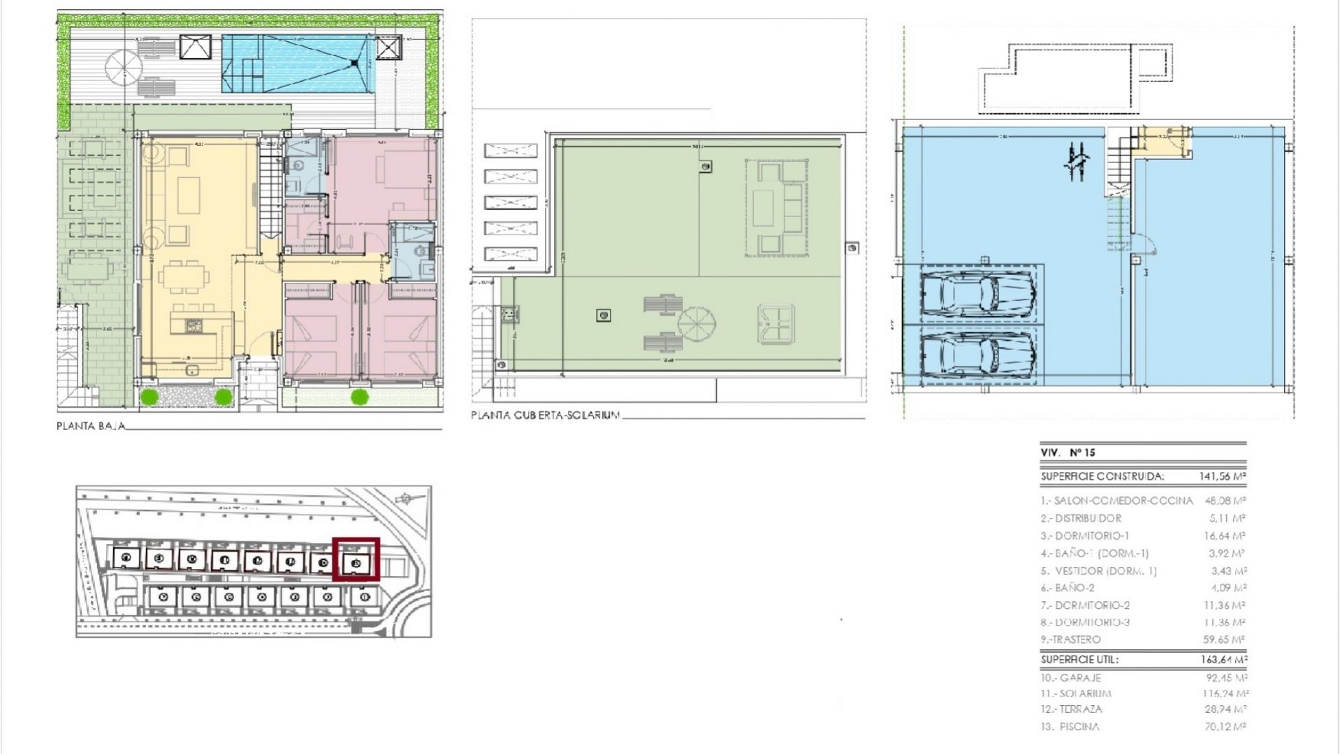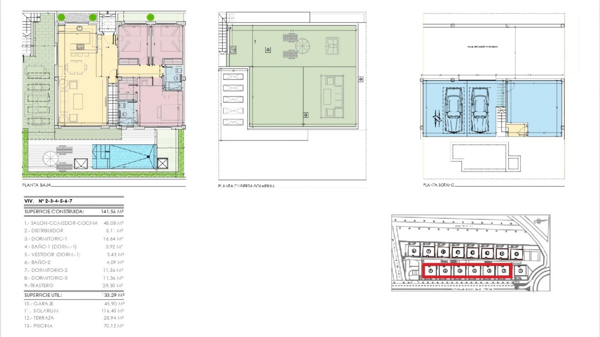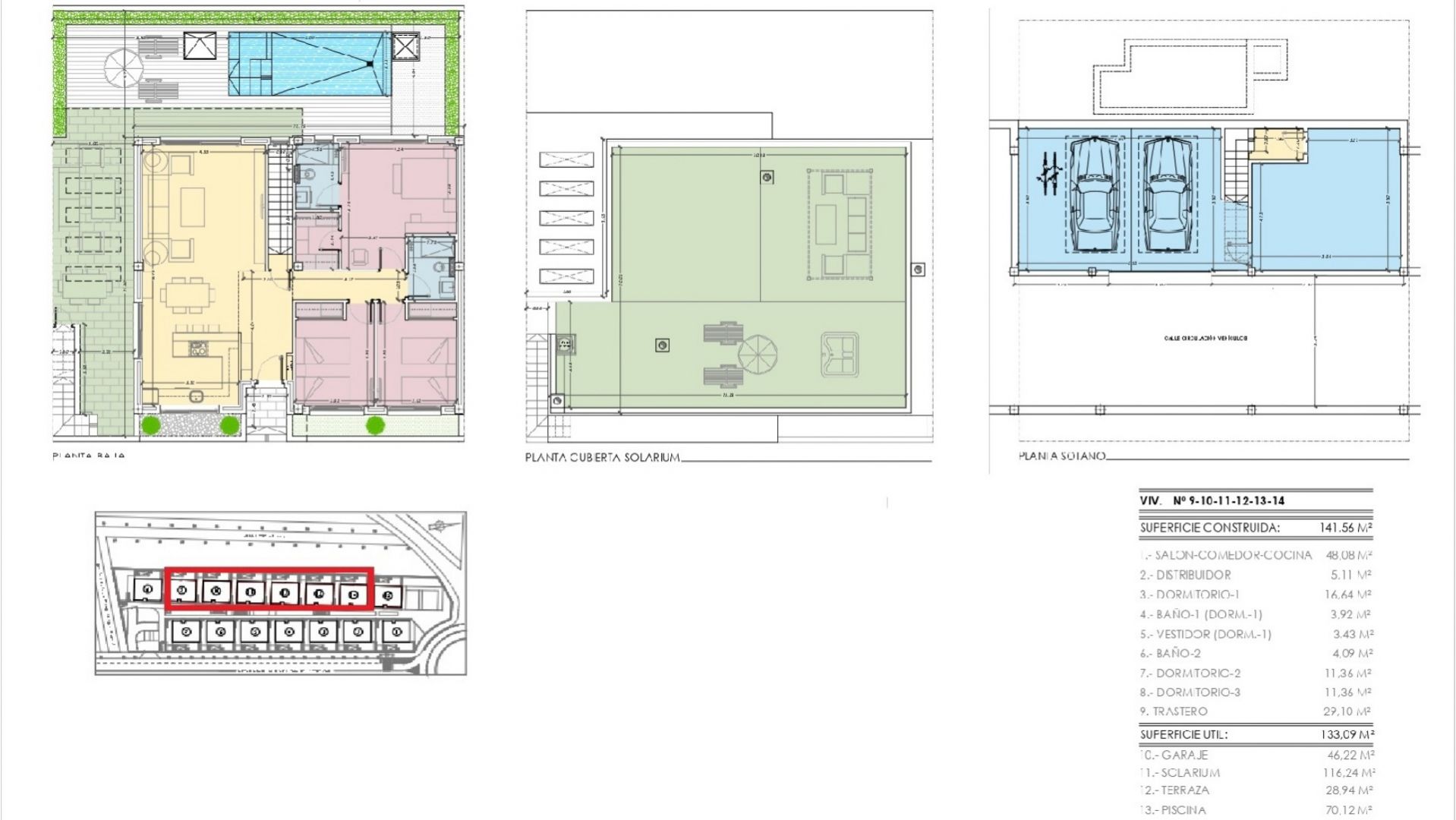 Las villas cuentan con 141,56 m² de superficie construida en una sola planta, diseñadas para maximizar comodidad y amplitud. Disponen de 3 dormitorios y 2 baños, un salón espacioso y luminoso y una cocina totalmente equipada. Desde el salón y el dormitorio principal se accede directamente a la terraza, la piscina privada y el jardín, con parcelas desde 247,56 m² hasta 327,71 m2, creando una conexión perfecta entre interior y exterior. Los otros dos dormitorios cuentan con salida a una amplia terraza posterior de 28,94 m², aportando privacidad y luminosidad adicional. En la planta superior se encuentra un espectacular solárium privado de 116,4 m², ideal para disfrutar del sol durante todo el año, crear una zona chill out o contemplar las vistas abiertas hacia las lagunas y el entorno natural. Desde el interior de la vivienda, una escalera conduce al sótano, donde se ubica un amplio garaje privado con capacidad para 2 o 3 vehículos, con superficies que van desde 45,9 m² hasta 92,6 m², además de estancias adicionales multifuncionales de 29,1 m² a 60 m², perfectas para gimnasio, sala de ocio, despacho o apartamento independiente.