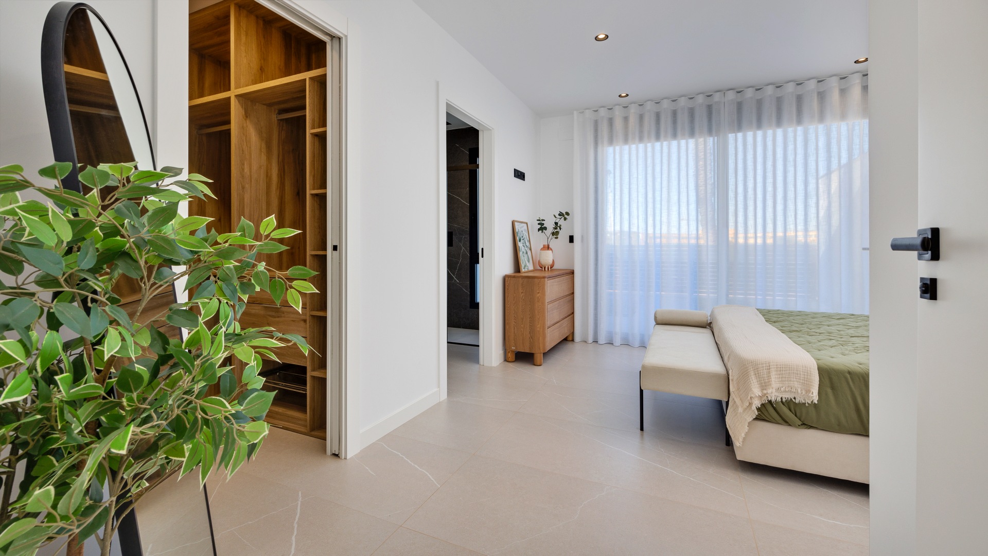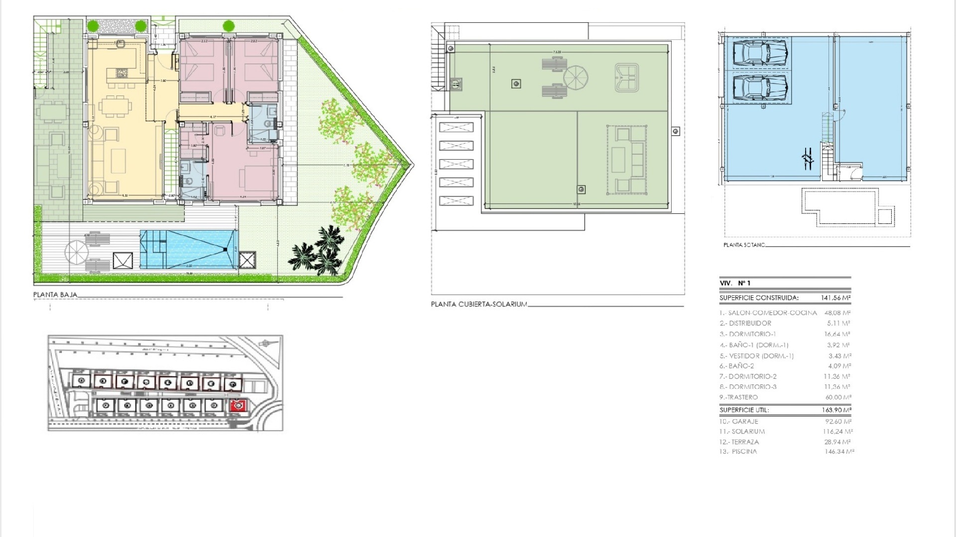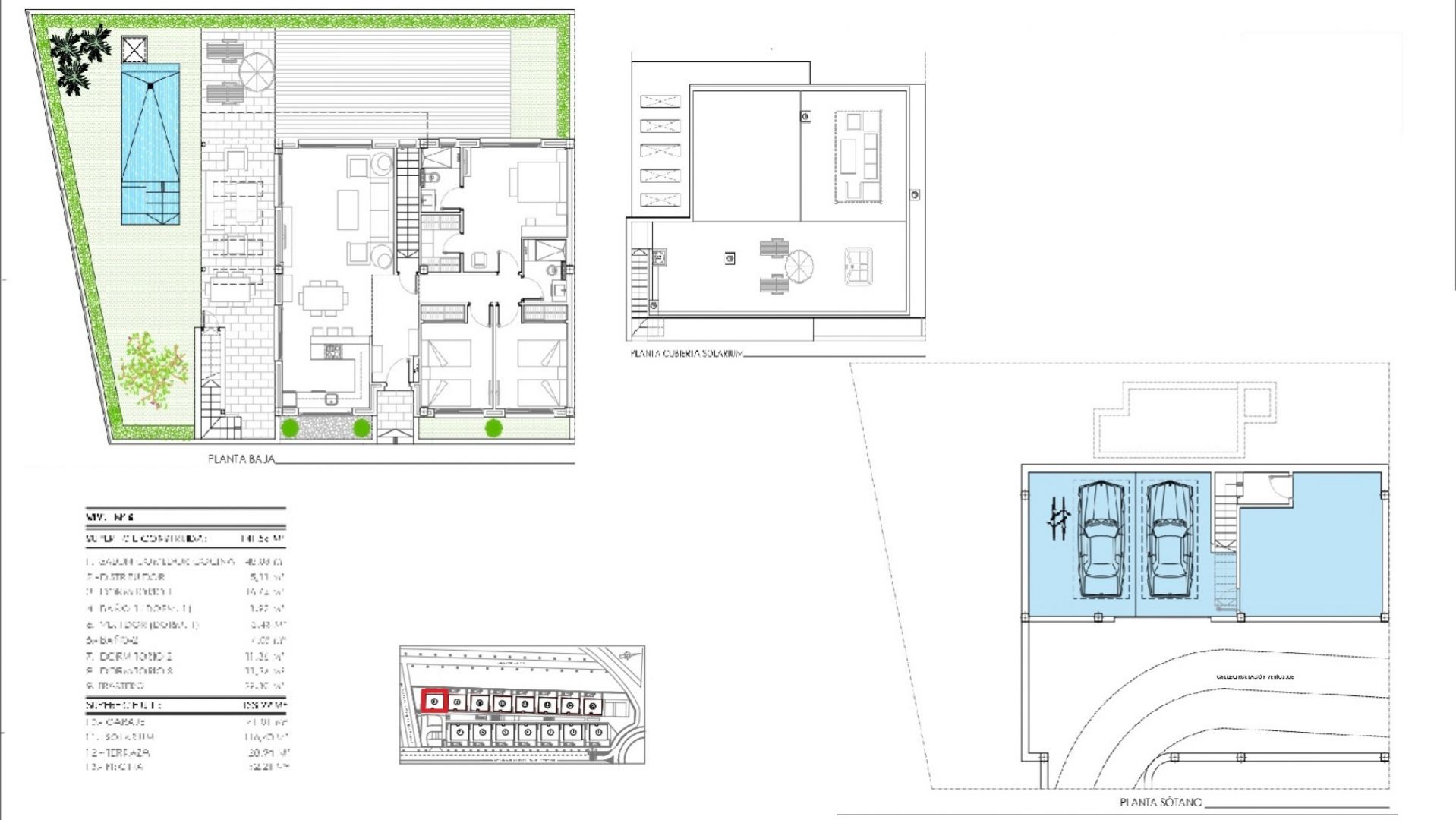 Las villas cuentan con 141,56 m² de superficie construida en una sola planta, diseñadas para maximizar comodidad y amplitud. Disponen de 3 dormitorios y 2 baños, un salón espacioso y luminoso y una cocina totalmente equipada. Desde el salón y el dormitorio principal se accede directamente a la terraza, la piscina privada y el jardín, con parcelas desde 247,56 m² hasta 327,71 m2, creando una conexión perfecta entre interior y exterior. Los otros dos dormitorios cuentan con salida a una amplia terraza posterior de 28,94 m², aportando privacidad y luminosidad adicional. En la planta superior se encuentra un espectacular solárium privado de 116,4 m², ideal para disfrutar del sol durante todo el año, crear una zona chill out o contemplar las vistas abiertas hacia las lagunas y el entorno natural. Desde el interior de la vivienda, una escalera conduce al sótano, donde se ubica un amplio garaje privado con capacidad para 2 o 3 vehículos, con superficies que van desde 45,9 m² hasta 92,6 m², además de estancias adicionales multifuncionales de 29,1 m² a 60 m², perfectas para gimnasio, sala de ocio, despacho o apartamento independiente.