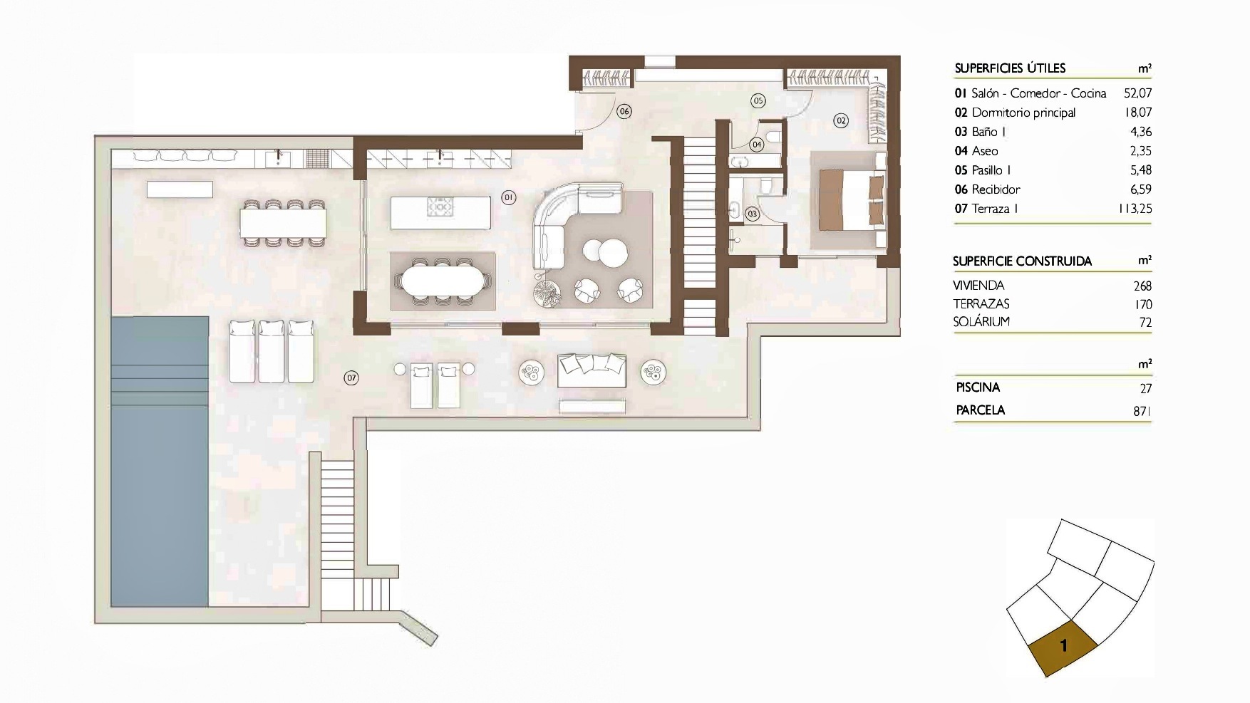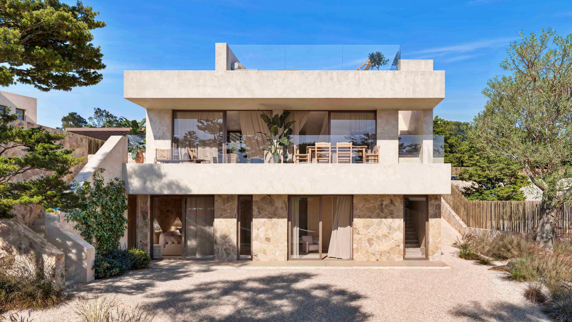 Estas villas modernas cuentan con 3 dormitorios y 3 baños, ofreciendo 263 m² construidos sobre amplias parcelas de aproximadamente 871 m². La vivienda se distribuye en dos plantas y destaca por sus vistas panorámicas al entorno natural, grandes ventanales y una excelente conexión entre interior y exterior. Cada propiedad dispone de amplias terrazas, piscina privada, jardín paisajístico y aparcamiento privado, creando un espacio ideal para disfrutar del clima mediterráneo durante todo el año.