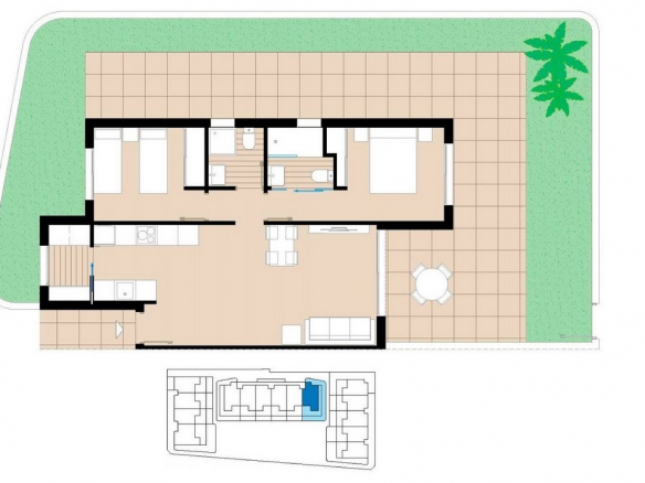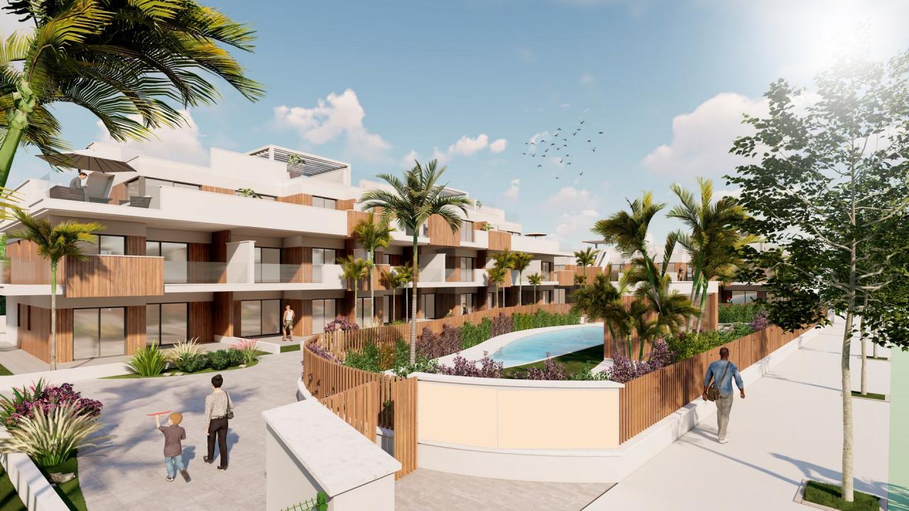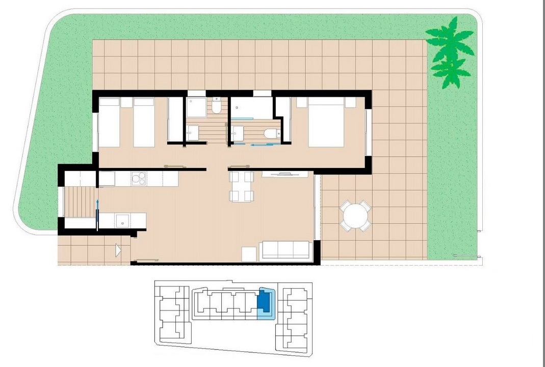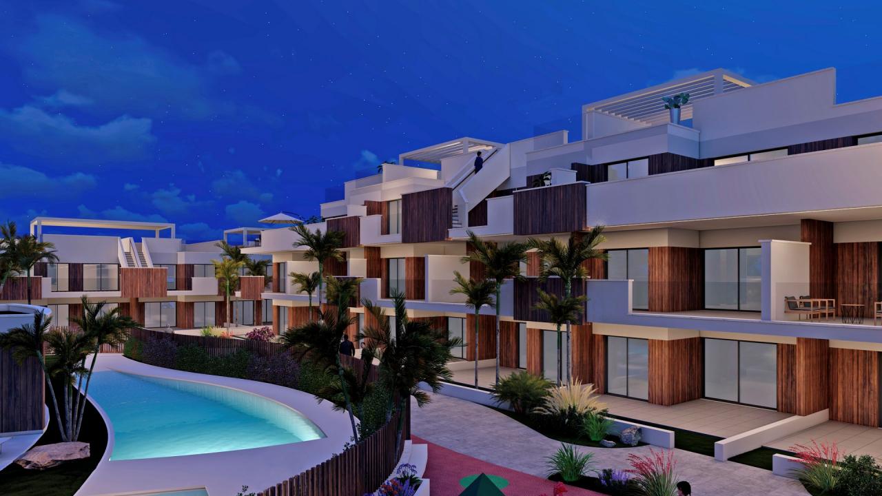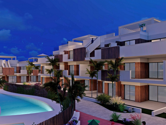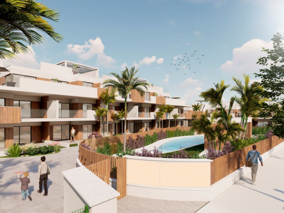El apartamento en esquina en planta baja tiene su propio jardín con vistas al piscina y pertenece a un conjunto residencial cerrado que consta de 34 apartamentos de 2 o 3 dormitorios y 2 baños.