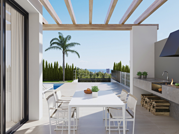 La zona exterior es una extensión perfecta de la vivienda, con una zona de barbacoa protegida por una amplia pérgola y dos terrazas cubiertas que ofrecen vistas impresionantes a la piscina, al skyline de Benidorm y al mar Mediterráneo.