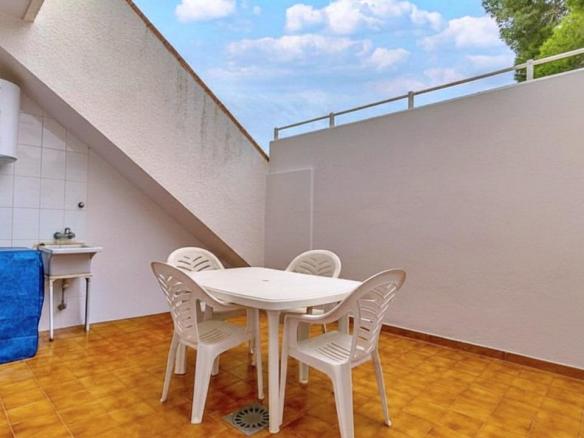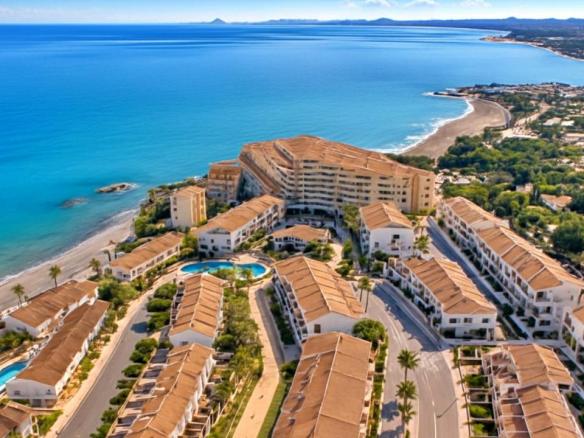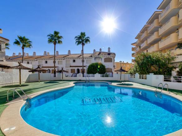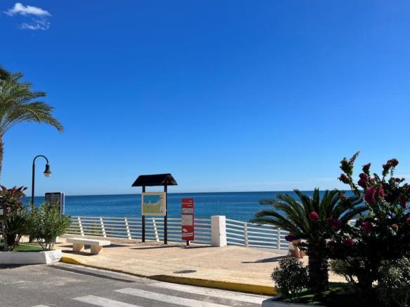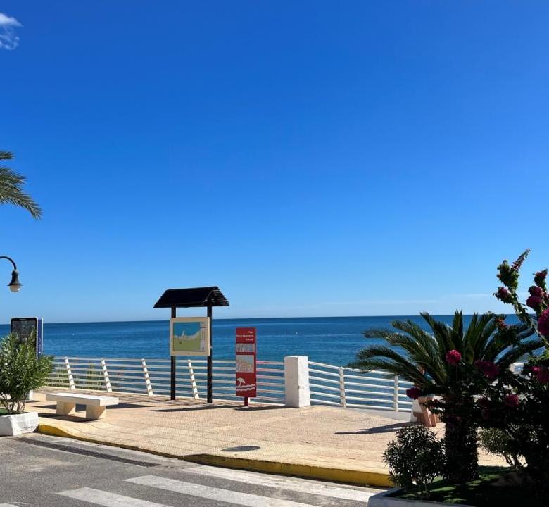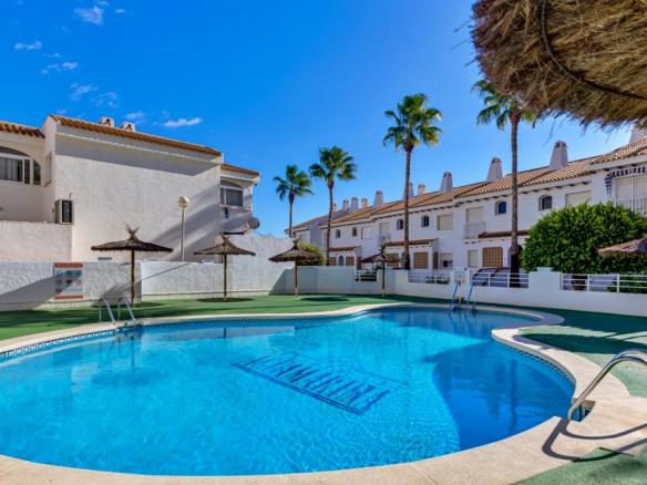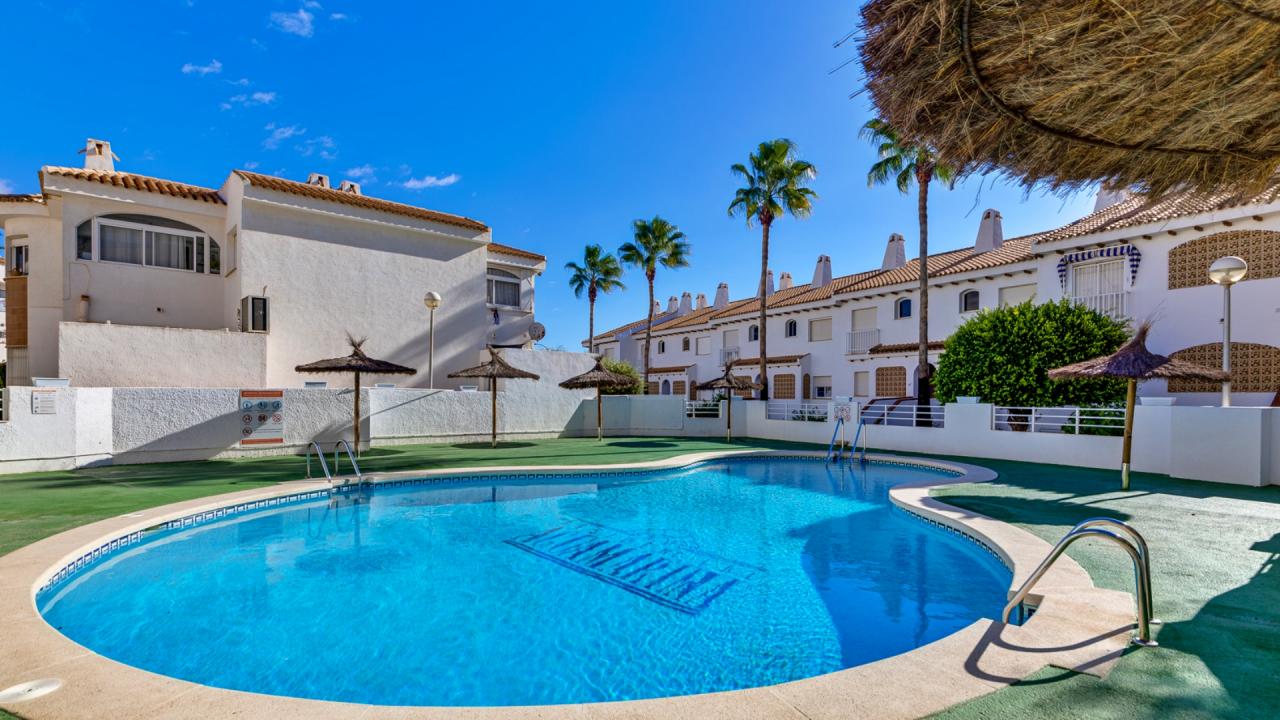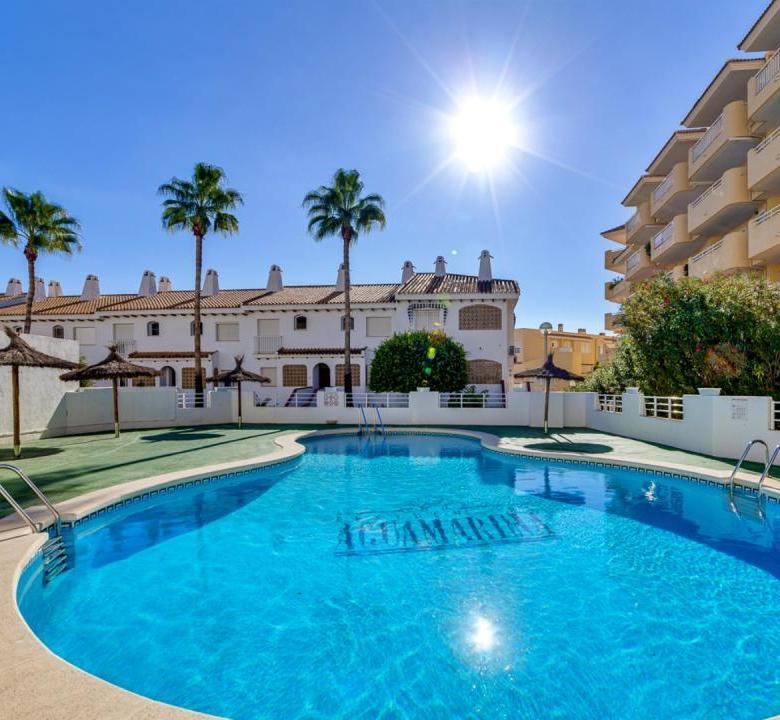 El complejo residencial cuenta con piscina comunitaria, amplias zonas verdes y ajardinadas, aparcamiento dentro del recinto y un ambiente tranquilo y seguro. La cercanía al mar es uno de sus mayores atractivos: solo unos pasos separan la vivienda de las aguas del Mediterráneo y de las playas de Aguamarina, conocidas por su limpieza y belleza natural.