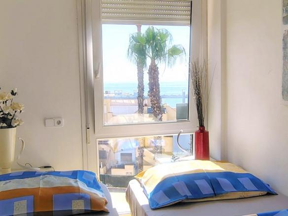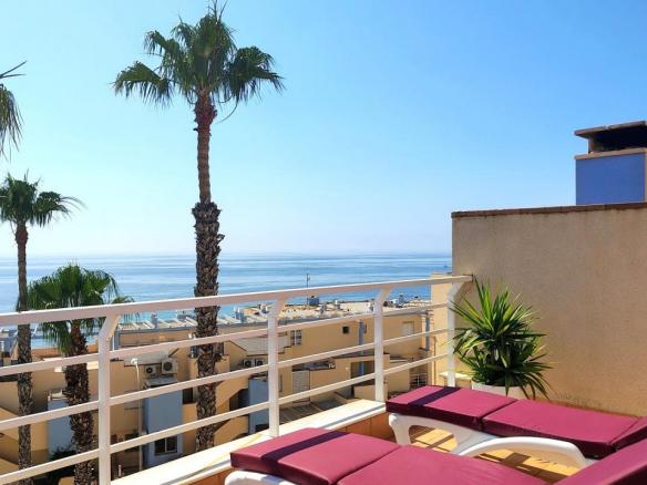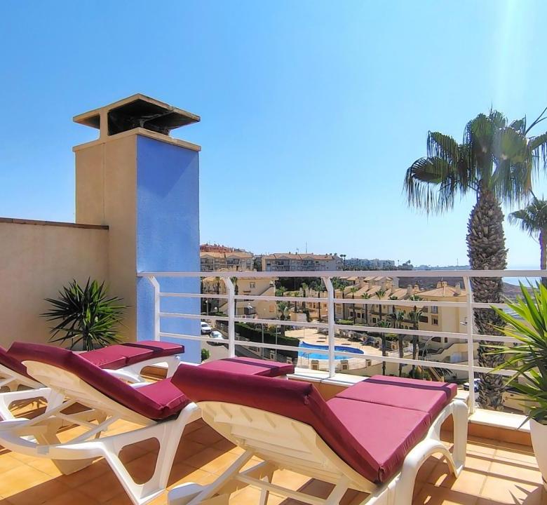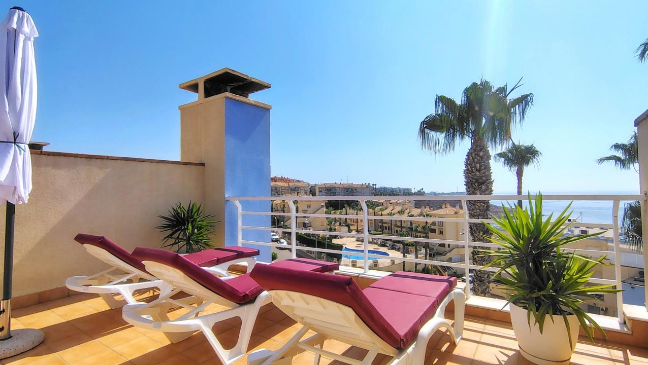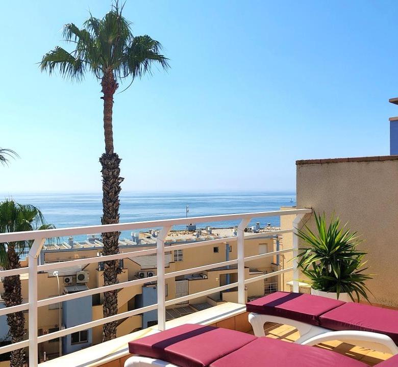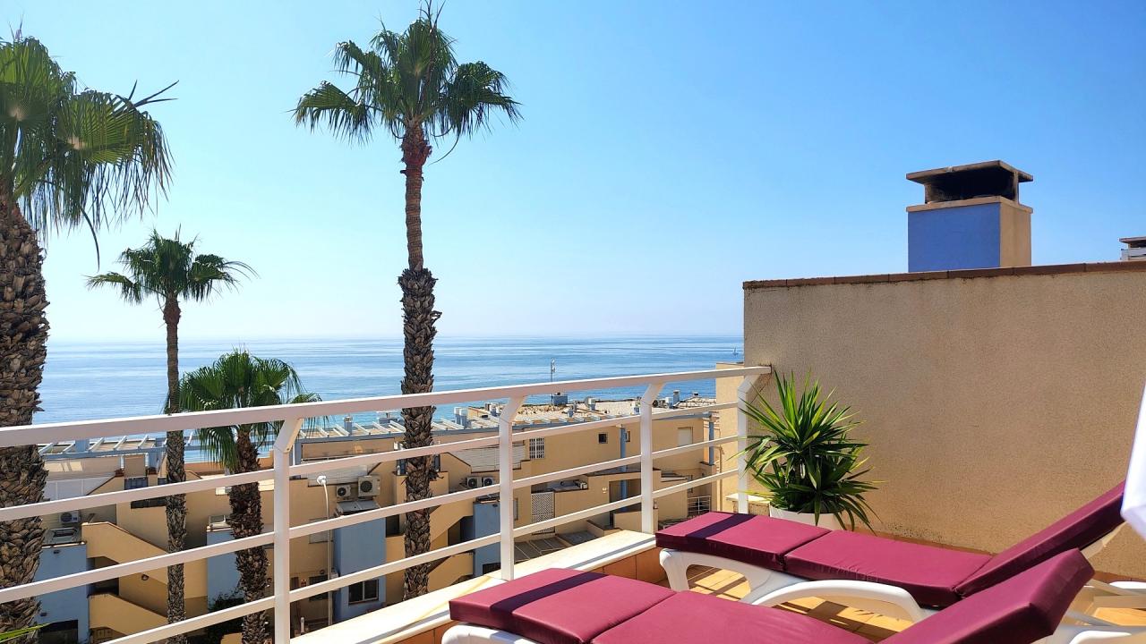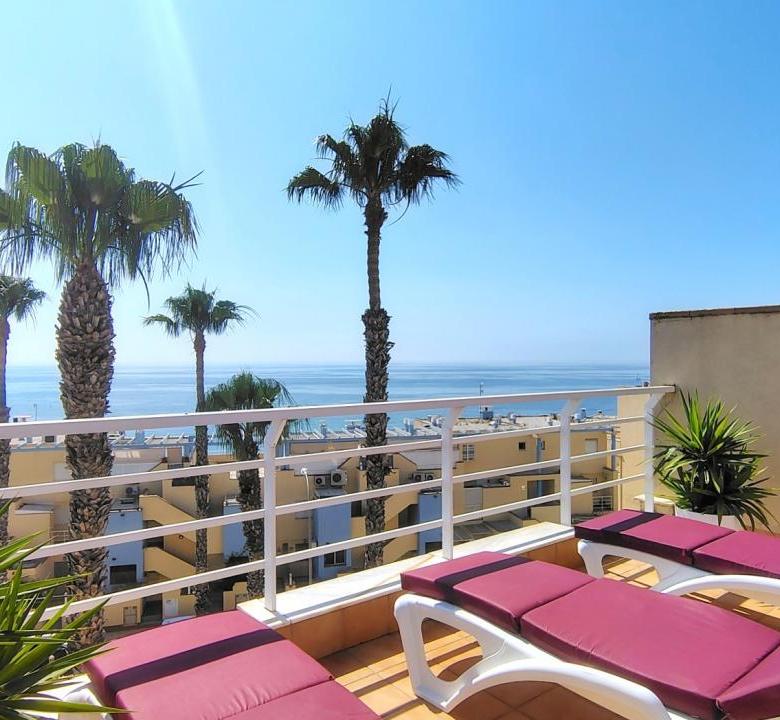 Una terraza-solárium con vistas panorámicas al mar, perfecta para relajarse al atardecer o disfrutar del desayuno con el Mediterráneo de fondo.