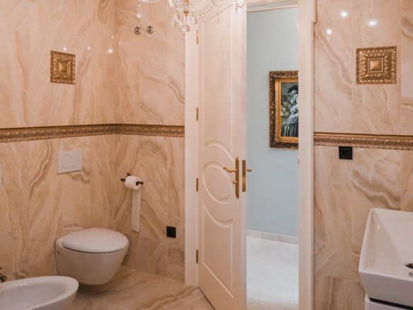 La casa también se divide en varias zonas. La entrada principal a la casa es una hermosa puerta que conduce a un amplio recibidor y desde él se accede a la sala de estar, comedor, cocina principal y auxiliar y cuarto técnico. O girando hacia el ala derecha de la casa, dirígete al área de descanso en el piso inferior. En planta baja hay dos amplios dormitorios, cada uno con su propio baño.